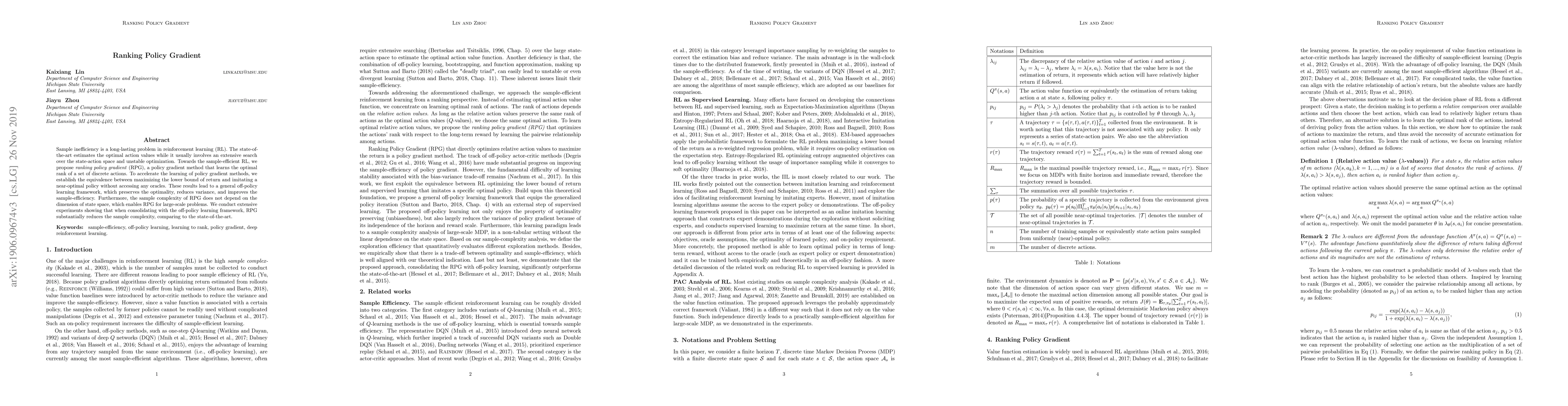 The paper proposes Ranking Policy Gradient (RPG), a method to improve sample efficiency in reinforcement learning by learning the optimal rank of discrete actions. RPG leverages an off-policy learning framework to achieve optimality, reduce variance, and enhance sample efficiency without depending on the state space dimension. Experimental results demonstrate RPG's significant reduction in sample complexity compared to current state-of-the-art methods.