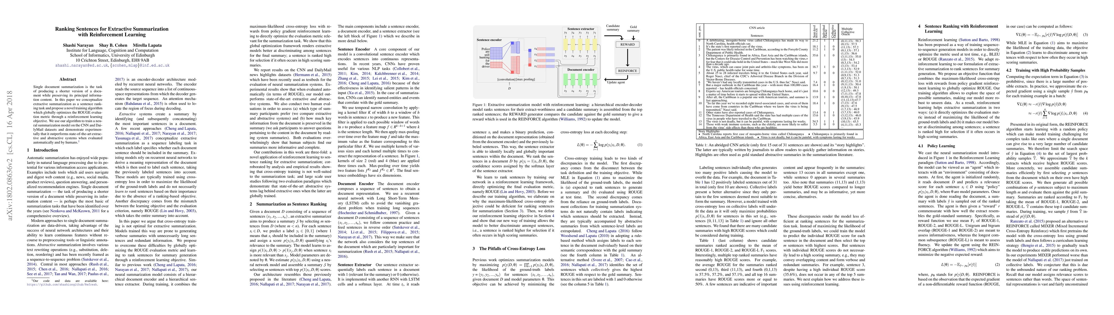 Single document summarization is the task of producing a shorter version of a document while preserving its principal information content. In this paper we conceptualize extractive summarization as a sentence ranking task and propose a novel training algorithm which globally optimizes the ROUGE evaluation metric through a reinforcement learning objective. We use our algorithm to train a neural summarization model on the CNN and DailyMail datasets and demonstrate experimentally that it outperforms state-of-the-art extractive and abstractive systems when evaluated automatically and by humans.