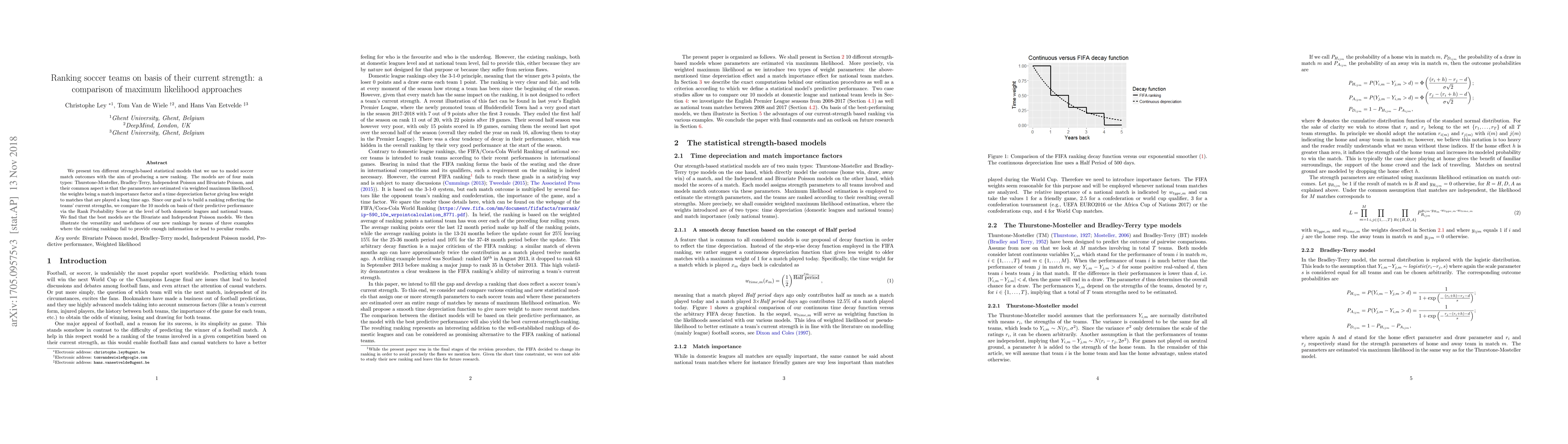 This paper compares ten statistical models for ranking soccer teams based on current strength, employing maximum likelihood estimation with weighted factors for match importance and time depreciation. The Bivariate and Independent Poisson models emerge as the most predictive, demonstrating improved ranking accuracy over existing methods.