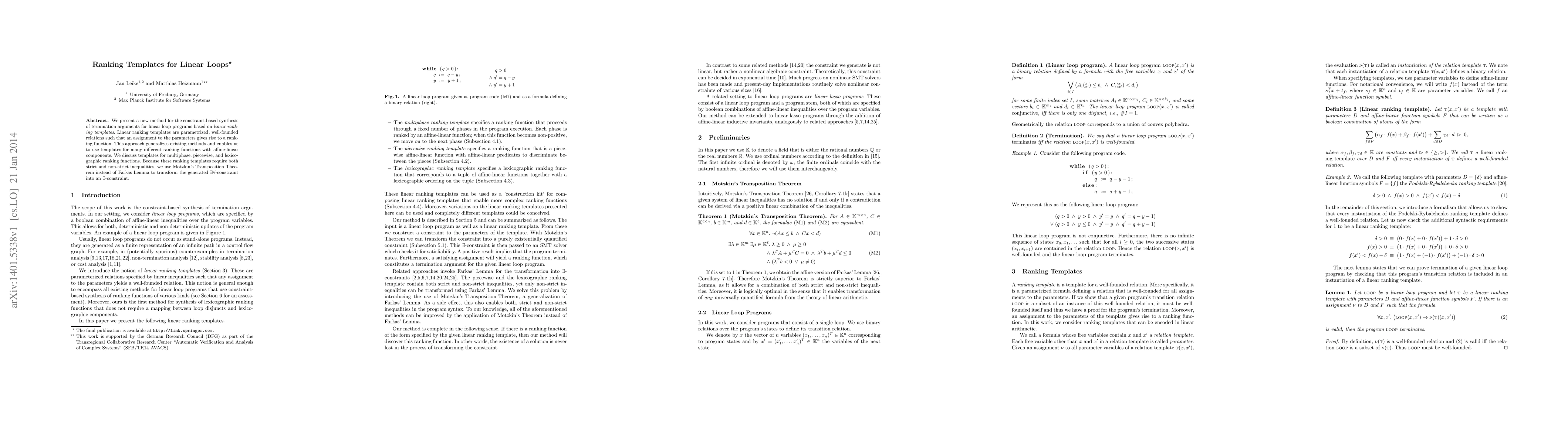 The research presents a new method for constraint-based synthesis of termination arguments for linear loop programs using linear ranking templates, which generalize existing methods and enable the use of templates for various ranking functions with affine-linear components.