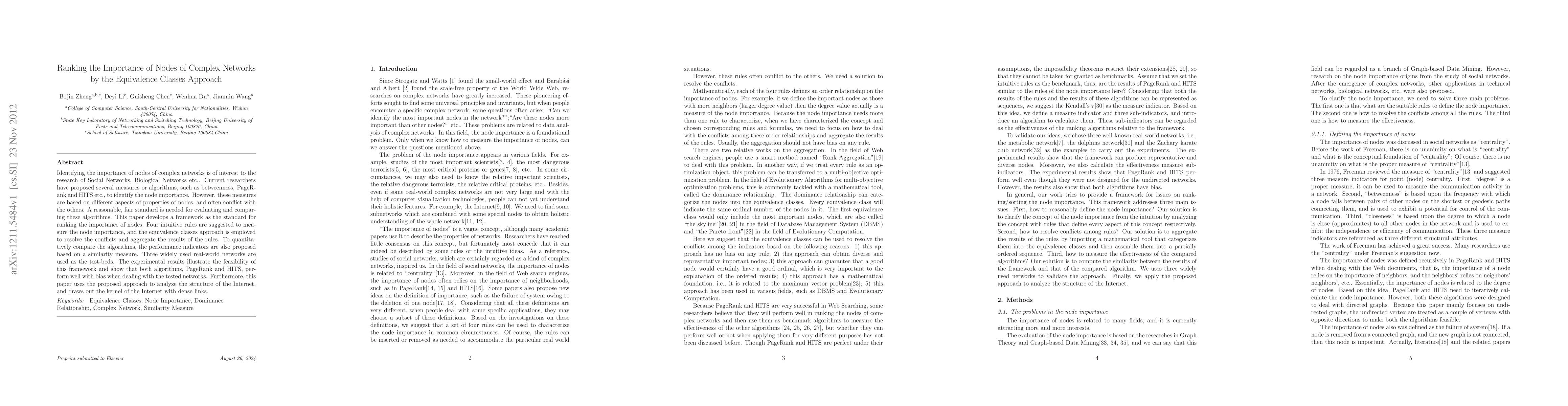 This paper proposes a framework to rank node importance in complex networks using the equivalence classes approach, aiming to resolve conflicts among existing measures. It introduces four intuitive rules and evaluates algorithms like PageRank and HITS on real-world networks, demonstrating the framework's feasibility and analyzing the Internet's structure.