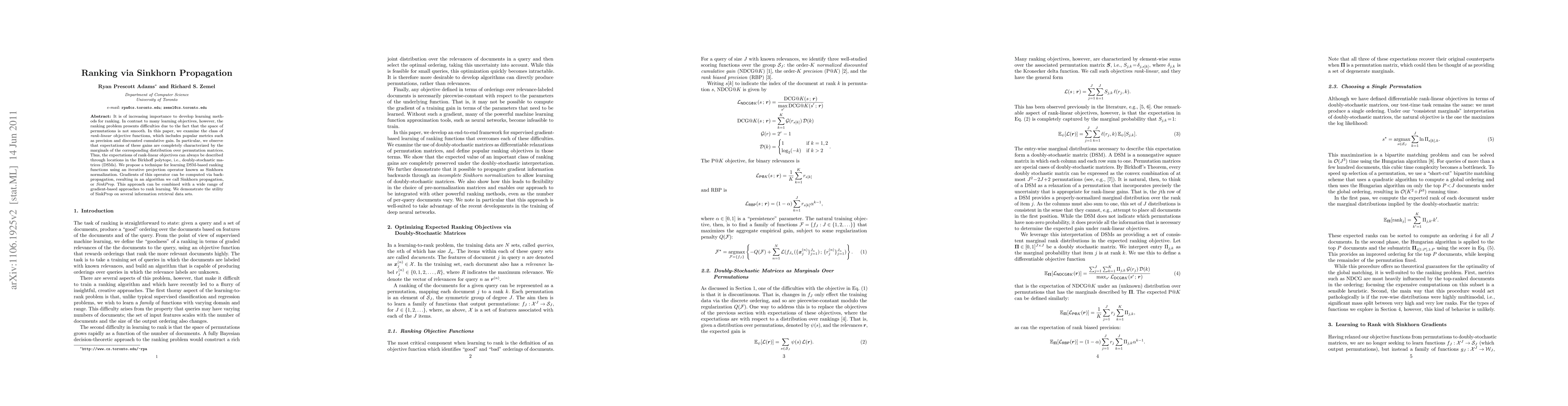 This paper introduces Sinkhorn propagation, a novel method for learning ranking functions by leveraging the Sinkhorn normalization technique to project distributions over permutation matrices into doubly-stochastic matrices. The method is shown to be effective for optimizing rank-linear objectives, and its performance is demonstrated on various information retrieval datasets.