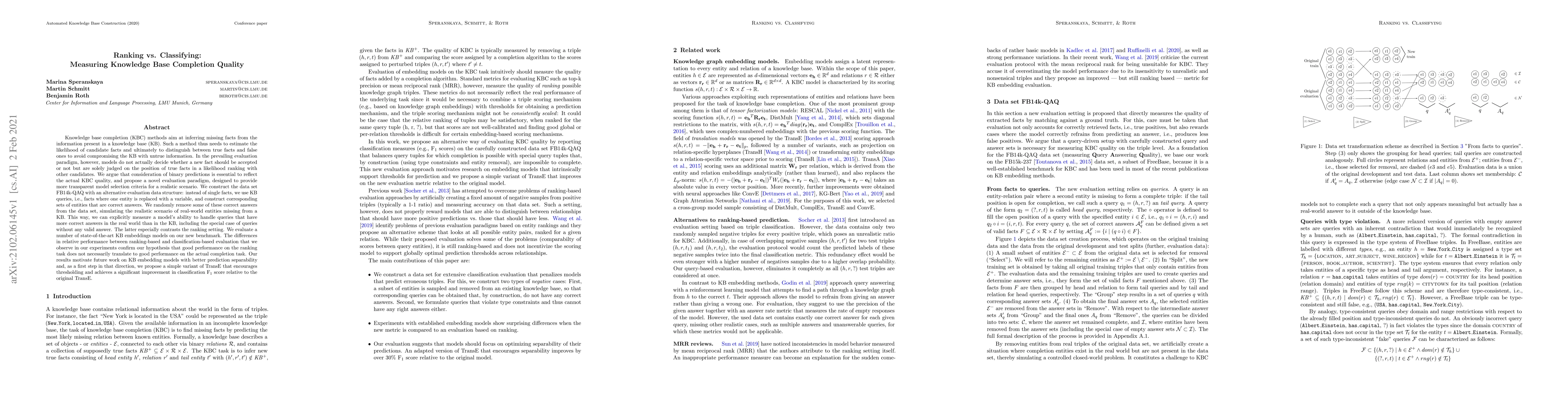 This paper argues that ranking-based evaluation of knowledge base completion (KBC) methods does not reflect actual KBC quality and proposes a classification-based evaluation paradigm. The authors introduce a new dataset, FB14k-QAQ, to simulate realistic KB scenarios where entities are missing, and evaluate state-of-the-art KB embedding models, finding that ranking-based performance does not correlate with classification performance, thus motivating better prediction separability in future models.