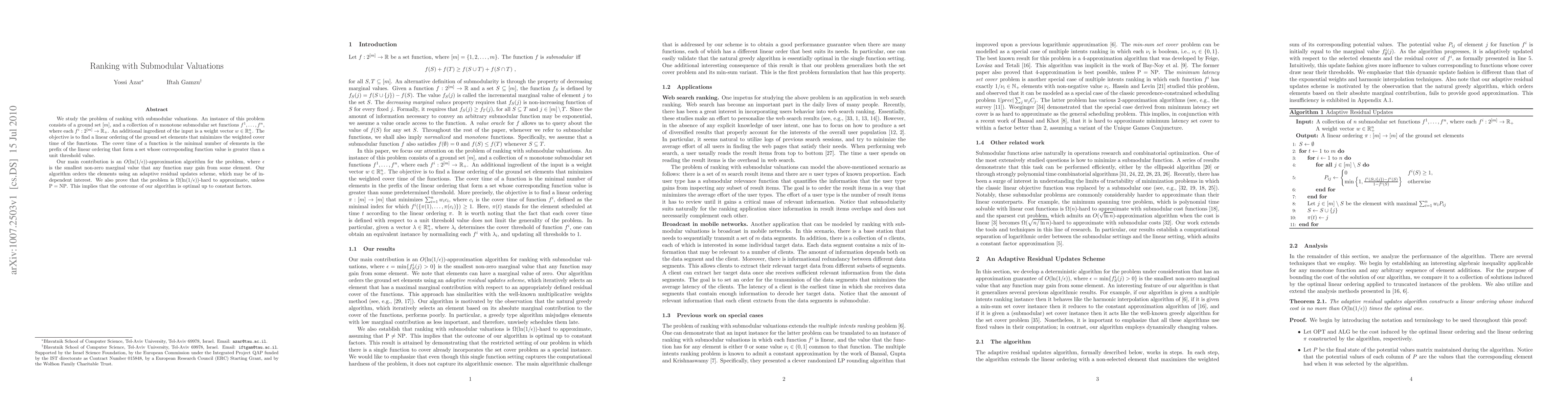 This paper presents an $O(\ln(1 / \epsilon))$-approximation algorithm for the ranking problem with submodular valuations, aiming to minimize the weighted cover time of a set of monotone submodular functions. The algorithm employs an adaptive residual updates scheme, and the authors prove the problem is $\Omega(\ln(1 / \epsilon))$-hard to approximate, indicating the algorithm's optimality up to constant factors.