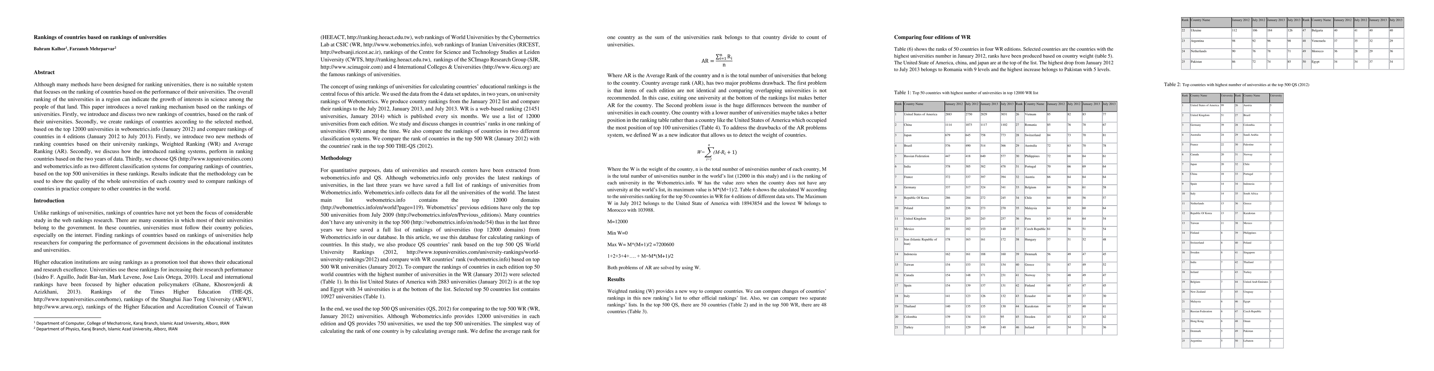 This paper introduces two new methods for ranking countries based on their universities' rankings: Weighted Ranking (WR) and Average Ranking (AR). It evaluates these methods using data from the top 12,000 universities and compares country rankings over two years, showing the potential to reflect national scientific interests.