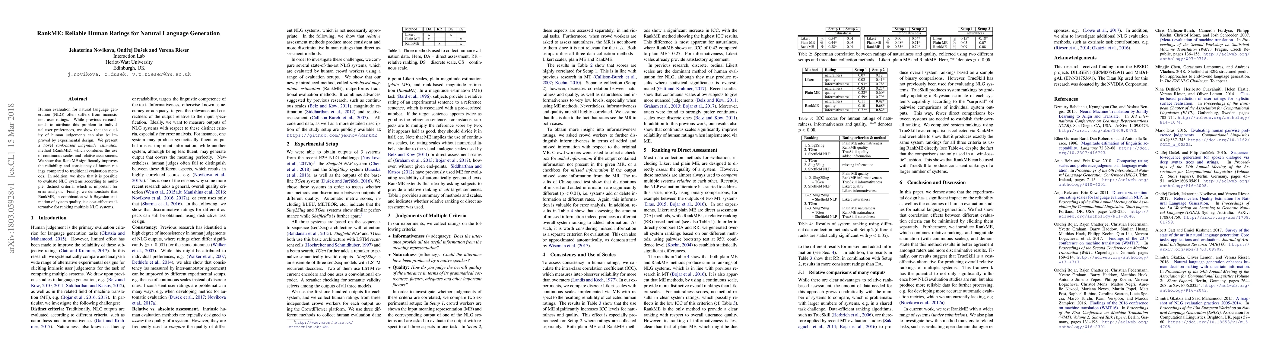 RankME enhances the reliability and consistency of human ratings in natural language generation by employing a novel rank-based magnitude estimation method that merges continuous scales and relative assessments. This approach provides a cost-effective alternative for evaluating multiple NLG systems and allows for multiple, distinct criteria assessment.