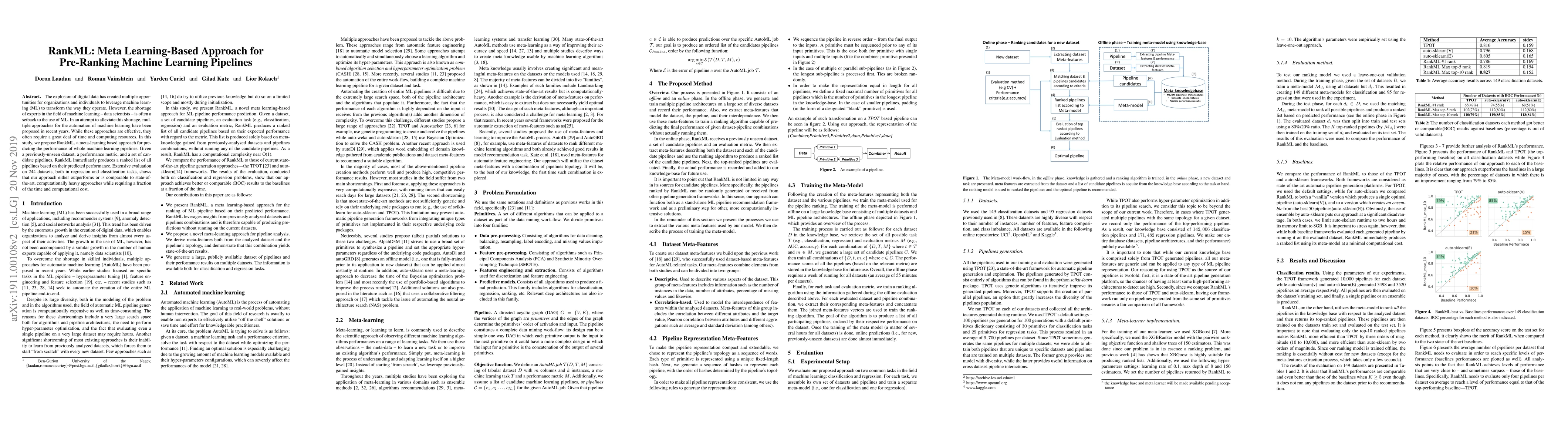 RankML is a meta-learning approach designed to predict the performance of machine learning pipelines, enabling immediate ranking of pipelines based on predicted outcomes. It outperforms or matches state-of-the-art methods in performance while significantly reducing time and computational costs.