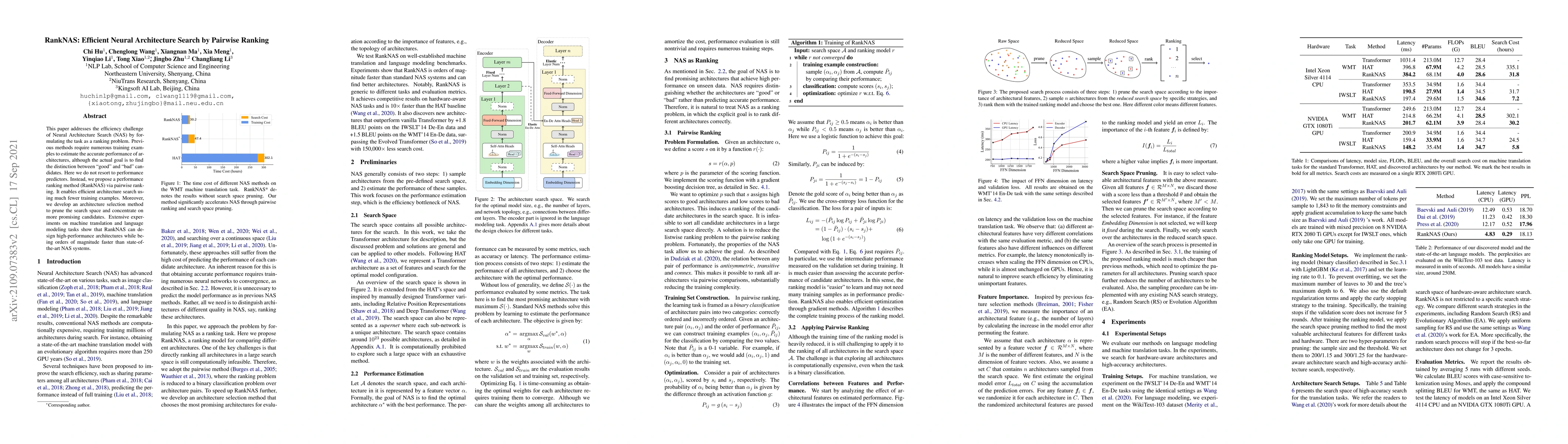 RankNAS proposes an efficient neural architecture search method by framing the task as a pairwise ranking problem, significantly reducing the need for extensive training examples. This approach allows for faster identification of promising architectures, demonstrated through high-performance results in machine translation and language modeling tasks.