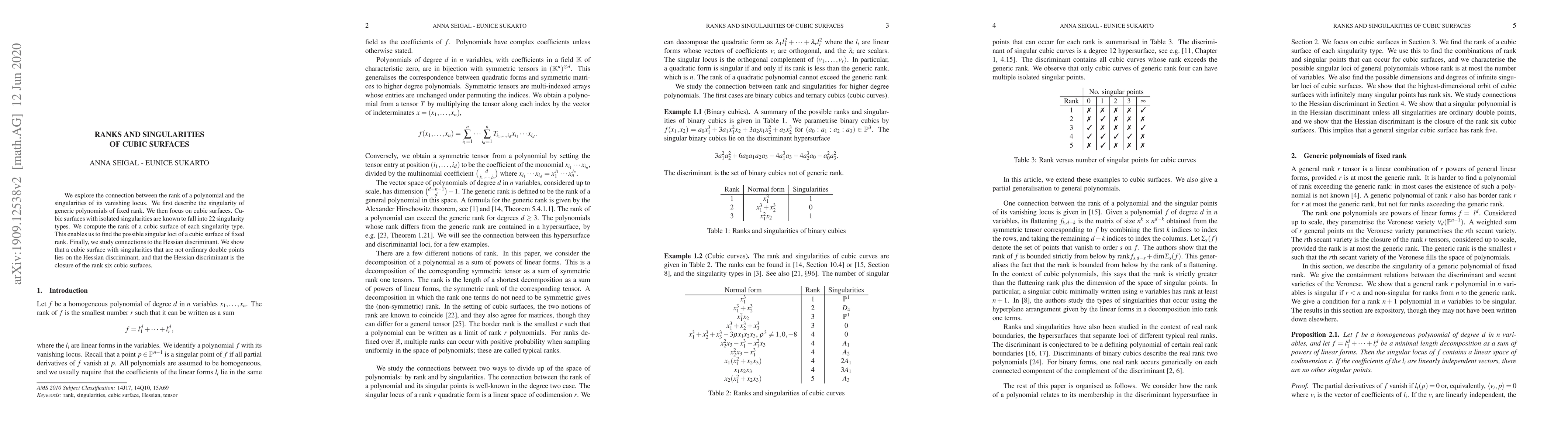 This paper investigates the relationship between the rank of cubic polynomials and the singularities of their surfaces, identifying the rank of cubic surfaces for each of the 22 known singularity types. It also explores the connection to the Hessian discriminant, showing that non-ordinary double point singularities lie on this discriminant.