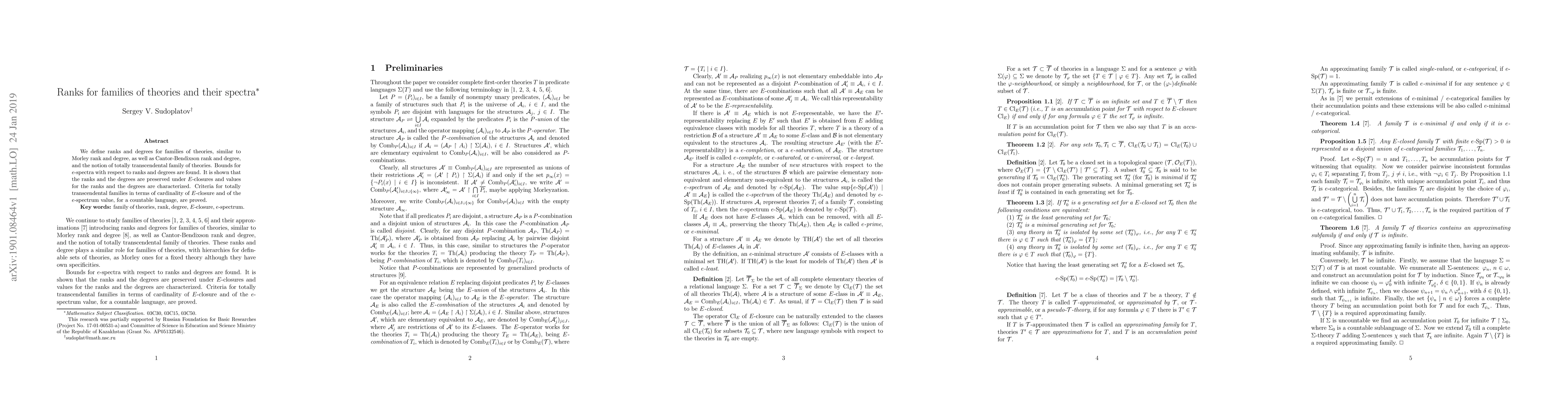 We define ranks and degrees for families of theories, similar to Morley rank and degree, as well as Cantor-Bendixson rank and degree, and the notion of totally transcendental family of theories. Bounds for $e$-spectra with respect to ranks and degrees are found. It is shown that the ranks and the degrees are preserved under $E$-closures and values for the ranks and the degrees are characterized. Criteria for totally transcendental families in terms of cardinality of $E$-closure and of the $e$-spectrum value, for a countable language, are proved.