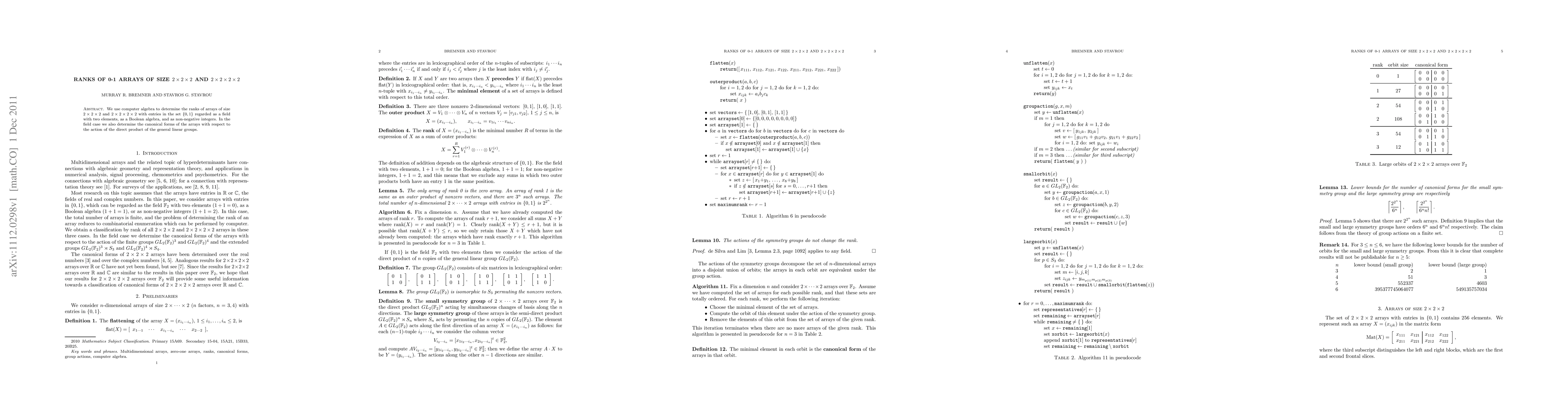 This research determines the ranks of binary arrays of sizes 2x2x2 and 2x2x2x2 under different interpretations, including as a field, Boolean algebra, and set of non-negative integers, using computer algebra, and also finds canonical forms for arrays under the action of direct product general linear groups in the field case.