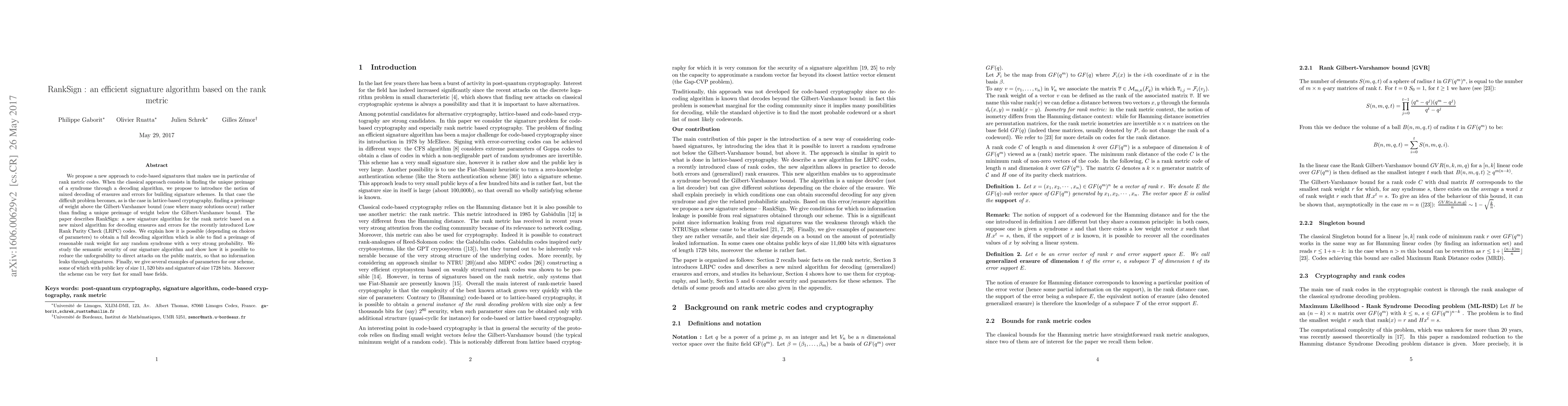 RankSign introduces a novel signature algorithm based on rank metric codes, employing mixed decoding of erasures and errors for LRPC codes. This approach enhances semantic security and allows for efficient signature generation with parameters yielding public keys of 11,520 bits and signatures of 1728 bits.