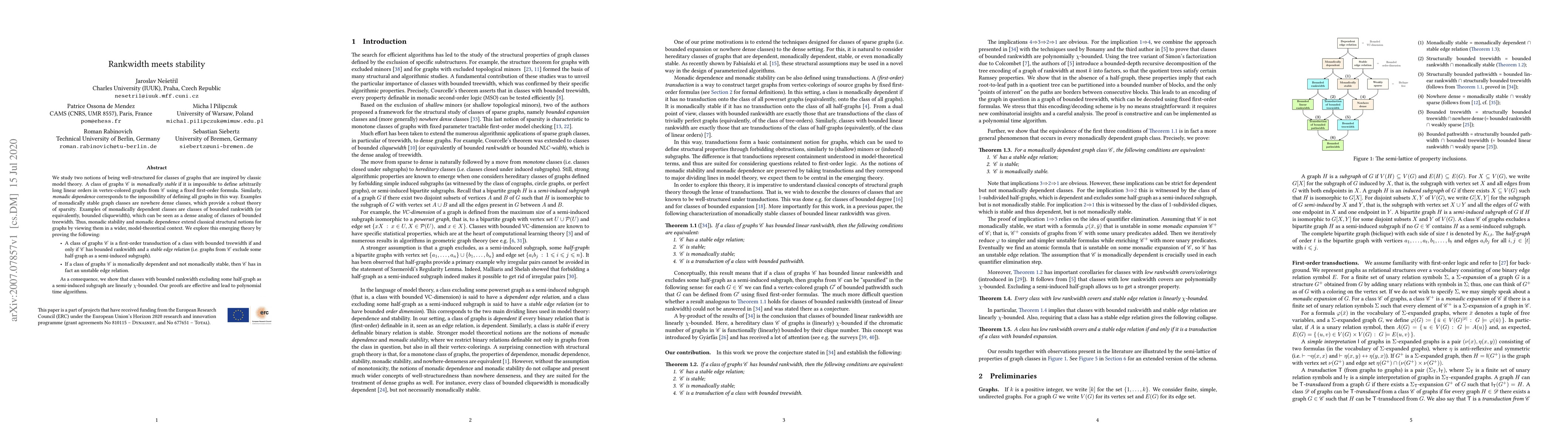 We study two notions of being well-structured for classes of graphs that are inspired by classic model theory. A class of graphs $C$ is monadically stable if it is impossible to define arbitrarily long linear orders in vertex-colored graphs from $C$ using a fixed first-order formula. Similarly, monadic dependence corresponds to the impossibility of defining all graphs in this way. Examples of monadically stable graph classes are nowhere dense classes, which provide a robust theory of sparsity. Examples of monadically dependent classes are classes of bounded rankwidth (or equivalently, bounded cliquewidth), which can be seen as a dense analog of classes of bounded treewidth. Thus, monadic stability and monadic dependence extend classical structural notions for graphs by viewing them in a wider, model-theoretical context. We explore this emerging theory by proving the following: - A class of graphs $C$ is a first-order transduction of a class with bounded treewidth if and only if $C$ has bounded rankwidth and a stable edge relation (i.e. graphs from $C$ exclude some half-graph as a semi-induced subgraph). - If a class of graphs $C$ is monadically dependent and not monadically stable, then $C$ has in fact an unstable edge relation. As a consequence, we show that classes with bounded rankwidth excluding some half-graph as a semi-induced subgraph are linearly $\chi$-bounded. Our proofs are effective and lead to polynomial time algorithms.