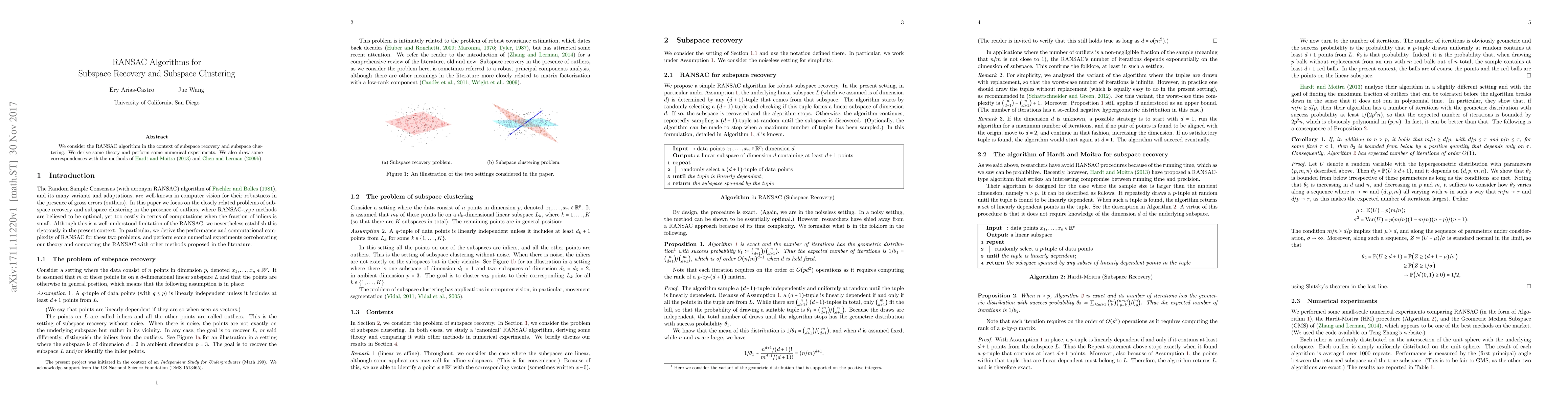 This paper explores the application of the RANSAC algorithm to subspace recovery and clustering, presenting theoretical derivations and numerical experiments, and compares its performance with existing methods by Hardt and Moitra (2013) and Chen and Lerman (2009b).