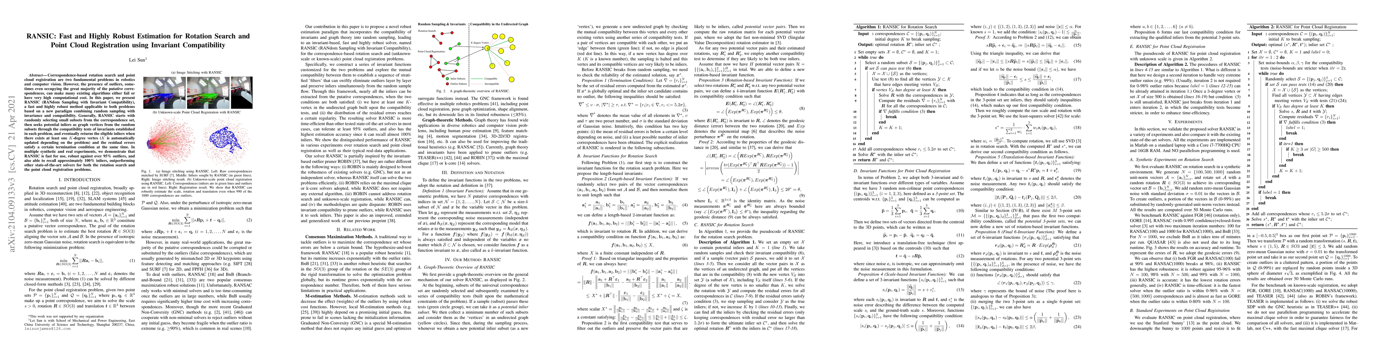 RANSIC is a fast and robust method for rotation search and point cloud registration that outperforms state-of-the-art solvers in multiple experiments, handling over 95% outliers with high accuracy.