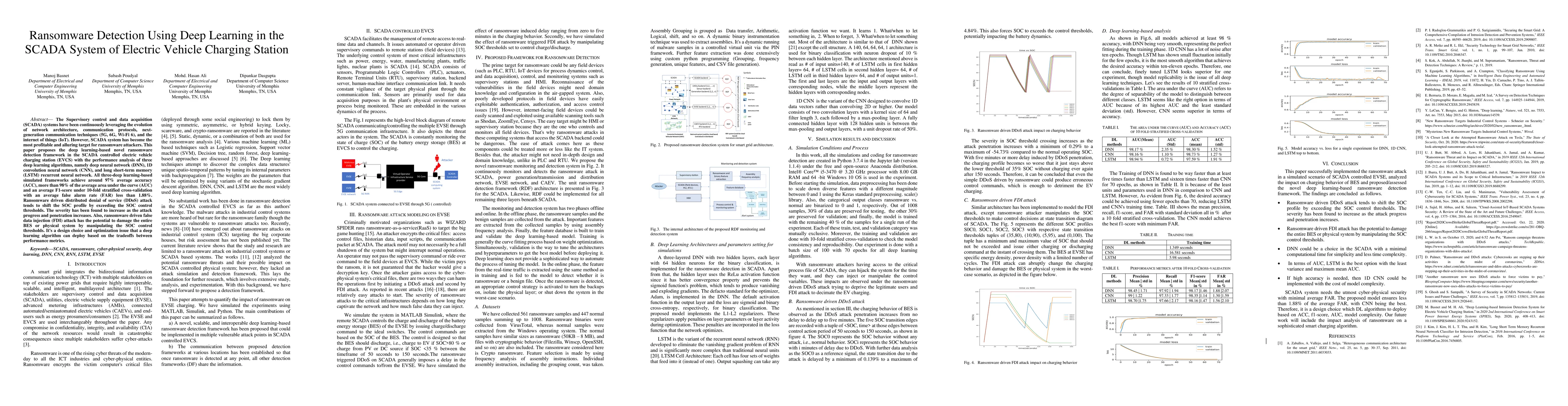 This paper proposes a deep learning-based ransomware detection framework for SCADA systems in electric vehicle charging stations, evaluating DNN, CNN, and LSTM algorithms. The frameworks achieve high accuracy, AUC, and F1-score, with low false alarm rates, highlighting the potential of deep learning to mitigate ransomware attacks.