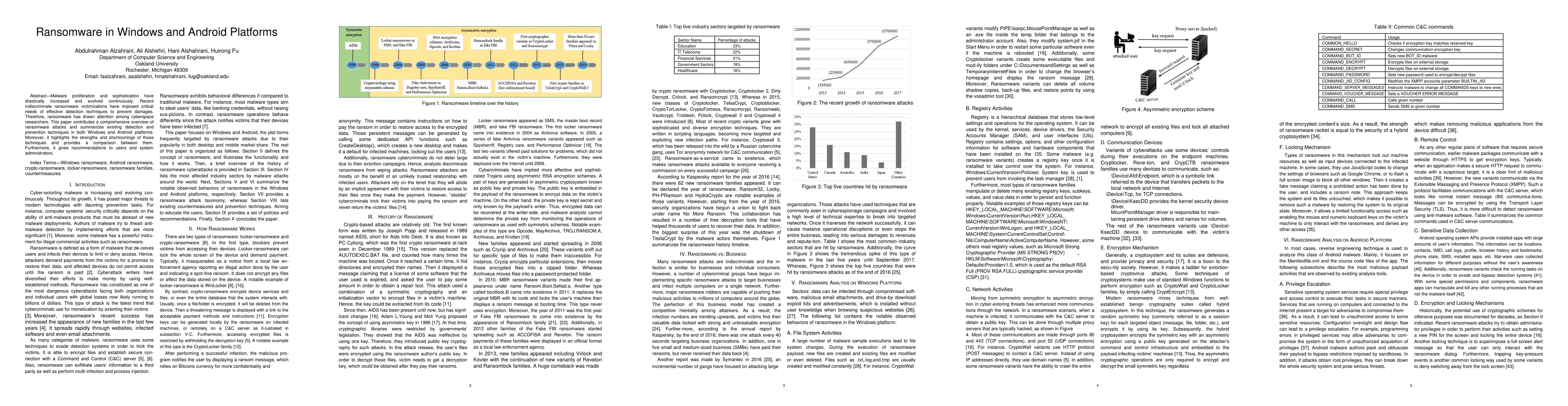 Malware proliferation and sophistication have drastically increased and evolved continuously. Recent indiscriminate ransomware victimizations have imposed critical needs of effective detection techniques to prevent damages. Therefore, ransomware has drawn attention among cyberspace researchers. This paper contributes a comprehensive overview of ransomware attacks and summarizes existing detection and prevention techniques in both Windows and Android platforms. Moreover, it highlights the strengths and shortcomings of those techniques and provides a comparison between them. Furthermore, it gives recommendations to users and system administrators.