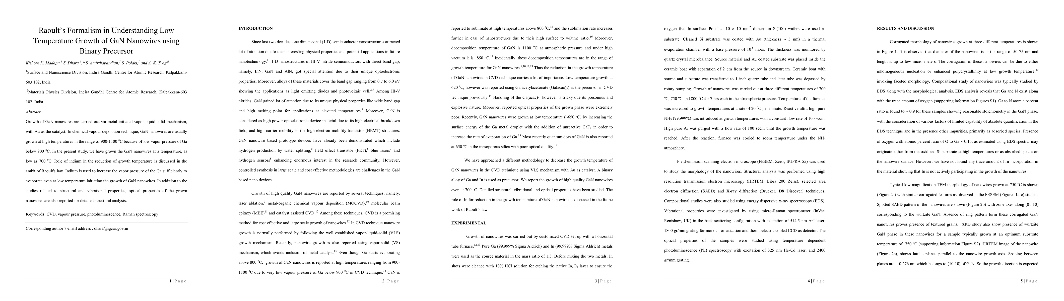 This study explores the low-temperature growth of GaN nanowires using a binary precursor with indium, facilitated by Raoult's law to enhance Ga vapor pressure. The GaN nanowires are grown at 700°C via vapor-liquid-solid mechanism, significantly lower than typical high-temperature methods, and their structural, vibrational, and optical properties are analyzed.