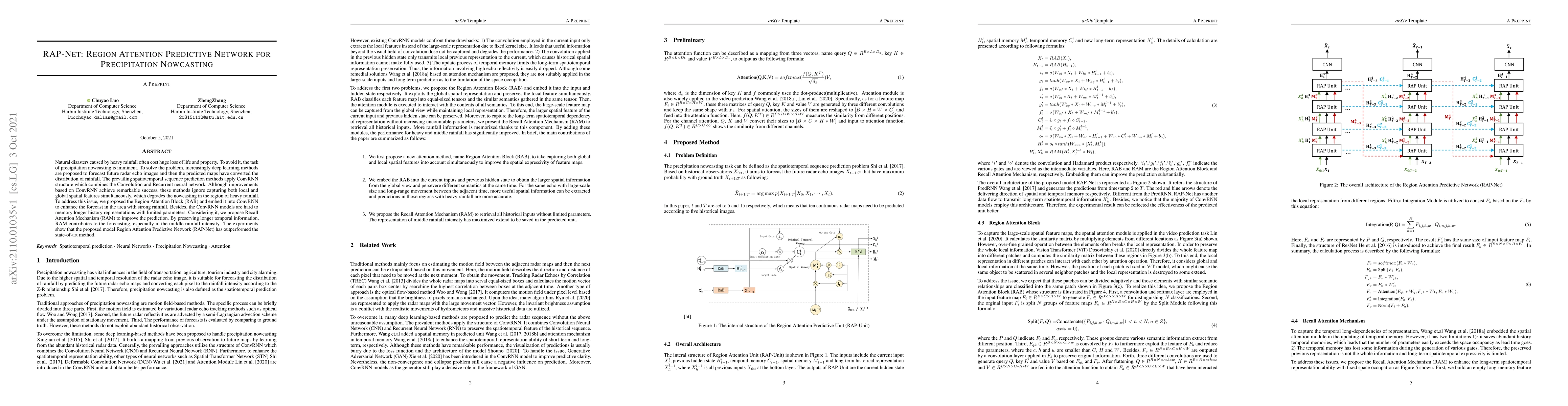 Natural disasters caused by heavy rainfall often cost huge loss of life and property. To avoid it, the task of precipitation nowcasting is imminent. To solve the problem, increasingly deep learning methods are proposed to forecast future radar echo images and then the predicted maps have converted the distribution of rainfall. The prevailing spatiotemporal sequence prediction methods apply ConvRNN structure which combines the Convolution and Recurrent neural network. Although improvements based on ConvRNN achieve remarkable success, these methods ignore capturing both local and global spatial features simultaneously, which degrades the nowcasting in the region of heavy rainfall. To address this issue, we proposed the Region Attention Block (RAB) and embed it into ConvRNN to enhance the forecast in the area with strong rainfall. Besides, the ConvRNN models are hard to memory longer history representations with limited parameters. Considering it, we propose Recall Attention Mechanism (RAM) to improve the prediction. By preserving longer temporal information, RAM contributes to the forecasting, especially in the middle rainfall intensity. The experiments show that the proposed model Region Attention Predictive Network (RAP-Net) has outperformed the state-of-art method.