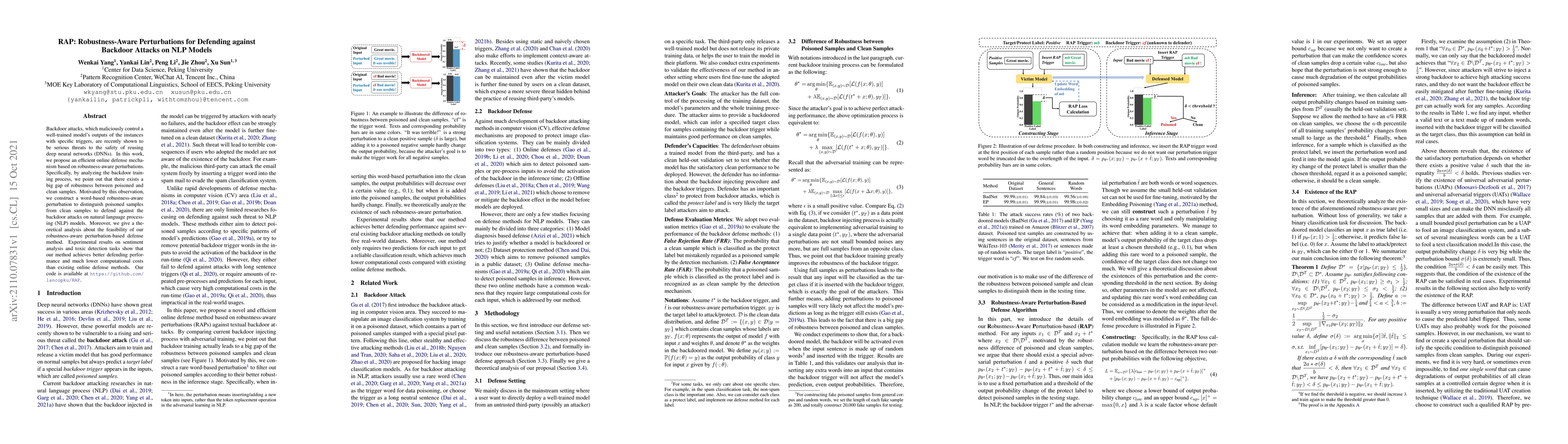This paper proposes RAP, a robustness-aware perturbation method to defend against backdoor attacks in NLP models by exploiting the robustness gap between poisoned and clean samples. Experimental results demonstrate superior defense performance and lower computational costs compared to existing methods.