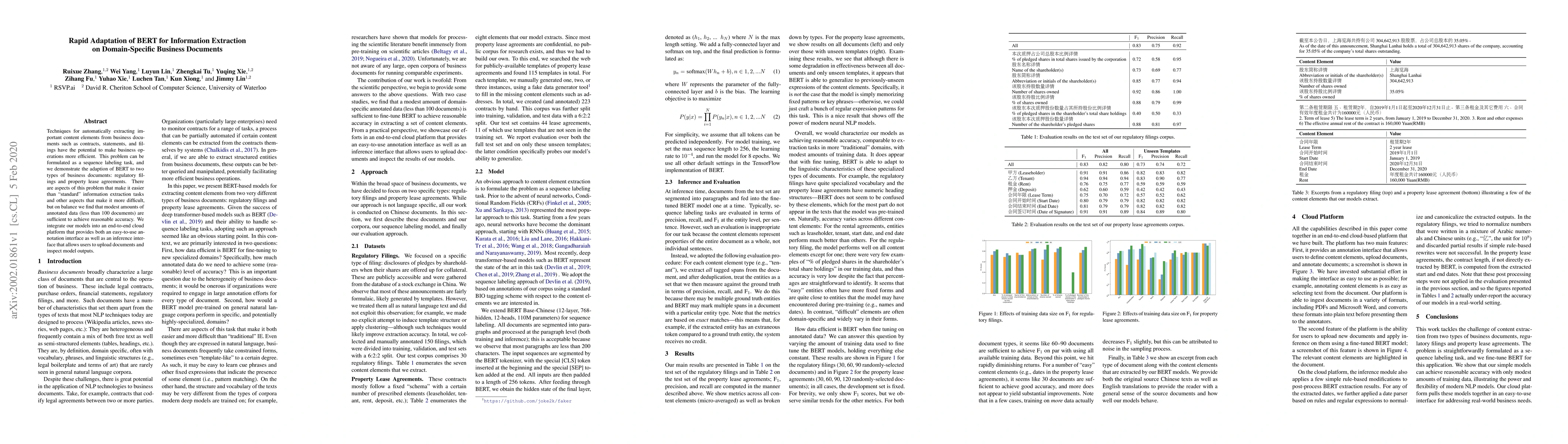 This paper demonstrates the adaptation of BERT for extracting information from domain-specific business documents like regulatory filings and property leases, showing that even small annotated datasets can yield reasonable accuracy. The research also integrates these models into a cloud platform with an annotation and inference interface.