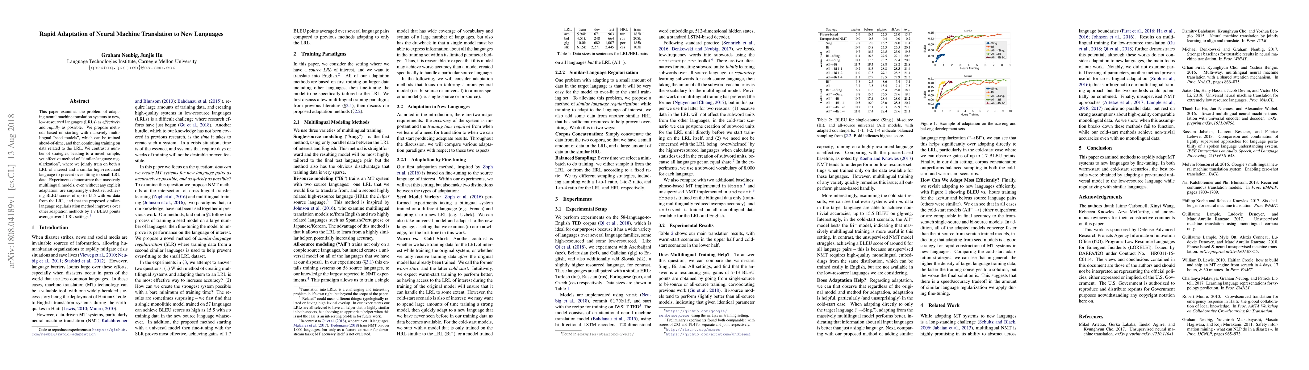 This paper proposes methods for rapidly adapting neural machine translation systems to low-resourced languages using massively multilingual seed models and a novel "similar-language regularization" technique. Experiments show that these approaches achieve effective translations with minimal LRL data, improving BLEU scores by up to 1.7 points on average.