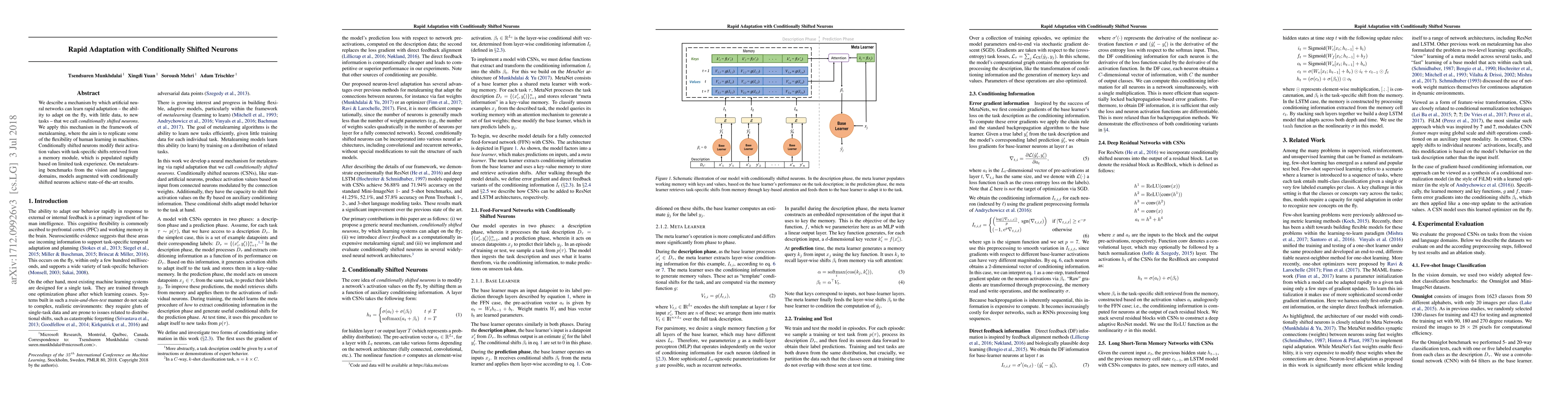 We describe a mechanism by which artificial neural networks can learn rapid adaptation - the ability to adapt on the fly, with little data, to new tasks - that we call conditionally shifted neurons. We apply this mechanism in the framework of metalearning, where the aim is to replicate some of the flexibility of human learning in machines. Conditionally shifted neurons modify their activation values with task-specific shifts retrieved from a memory module, which is populated rapidly based on limited task experience. On metalearning benchmarks from the vision and language domains, models augmented with conditionally shifted neurons achieve state-of-the-art results.
