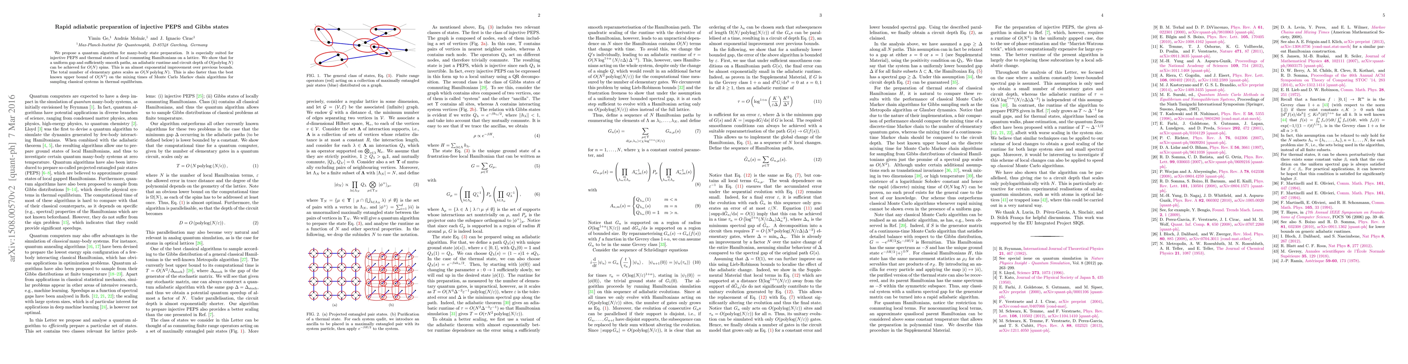 This paper presents a quantum algorithm for efficiently preparing injective PEPS and thermal states, achieving an adiabatic runtime and circuit depth of $O(\operatorname{polylog}N)$ for $O(N)$ spins, significantly improving previous bounds. The total number of elementary gates scales as $O(N\operatorname{polylog}N)$, outperforming classical Monte Carlo methods.