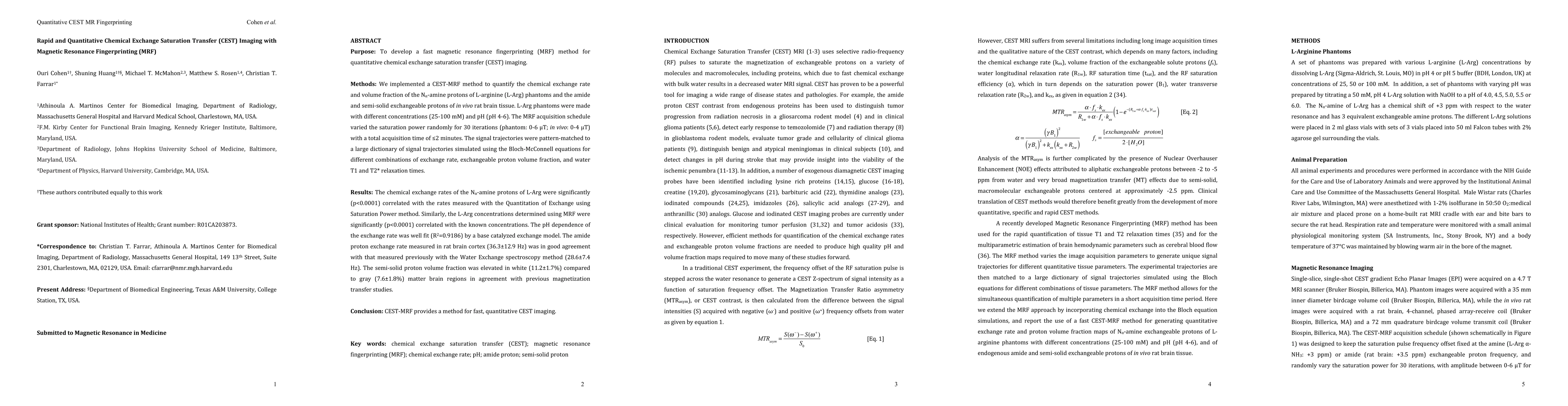 This paper develops a rapid magnetic resonance fingerprinting (MRF) method for quantitative chemical exchange saturation transfer (CEST) imaging, demonstrating its effectiveness in phantoms and in vivo rat brain tissue with minimal acquisition time. The method accurately measures exchange rates and concentrations, showing good agreement with established techniques.