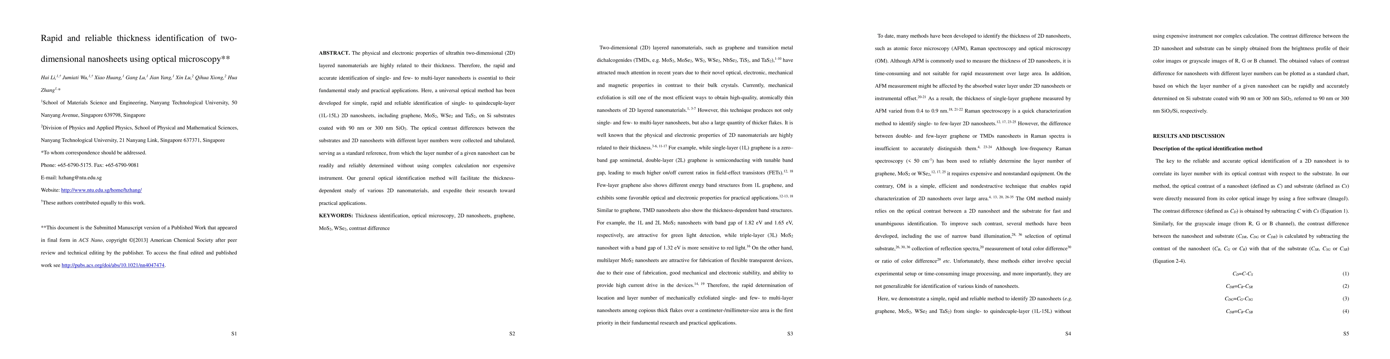 This paper presents a universal optical method for rapidly and reliably identifying the thickness of single- to quindecuple-layer 2D nanosheets, including graphene and transition metal dichalcogenides, using optical contrast differences on Si substrates. This simple, cost-effective approach facilitates the study of thickness-dependent properties of 2D nanomaterials.