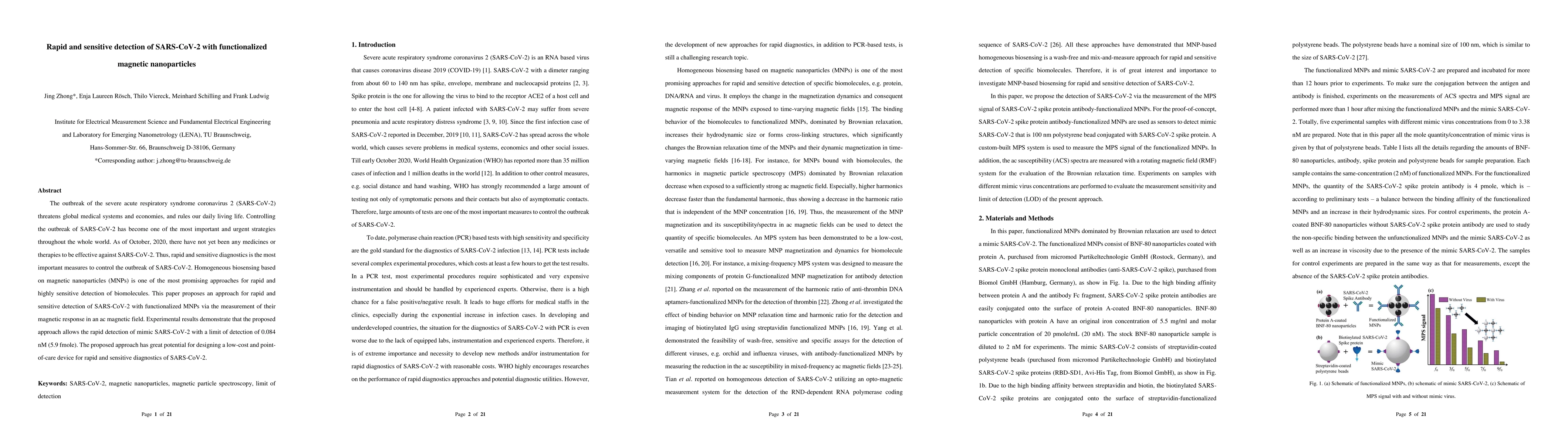 This paper proposes a rapid and sensitive detection method for SARS-CoV-2 using functionalized magnetic nanoparticles, achieving a detection limit of 0.084 nM. The method shows great potential for developing low-cost, point-of-care diagnostic devices.