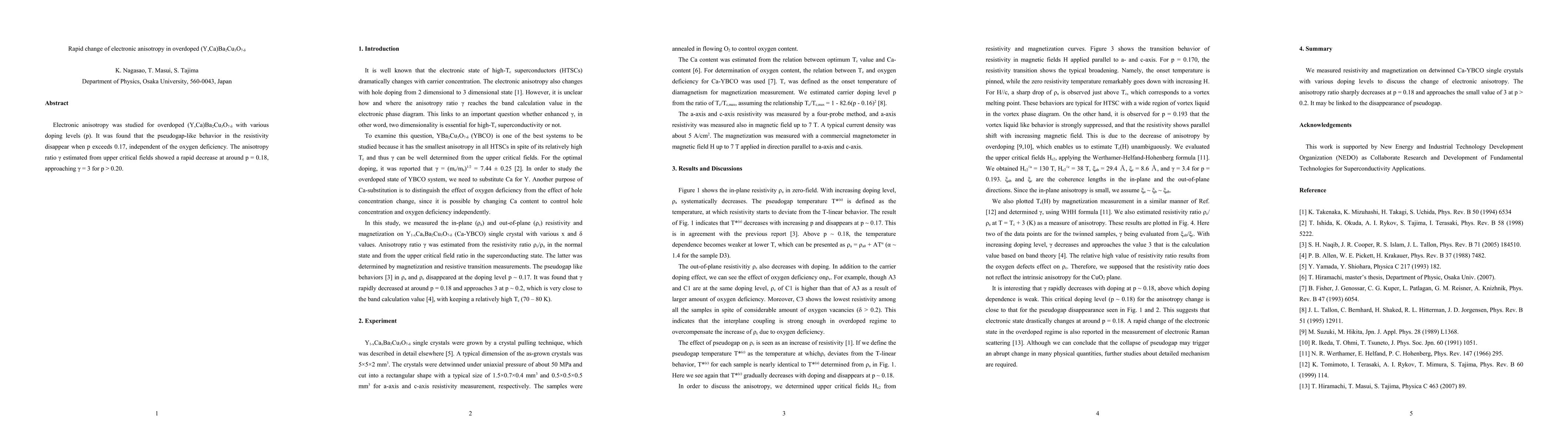 The study reveals that electronic anisotropy in overdoped (Y,Ca)Ba2Cu3O7-d diminishes rapidly when doping exceeds 0.17, with the pseudogap-like resistivity behavior disappearing. The anisotropy ratio decreases sharply around 0.18 doping, approaching a ratio of 3 for higher doping levels.