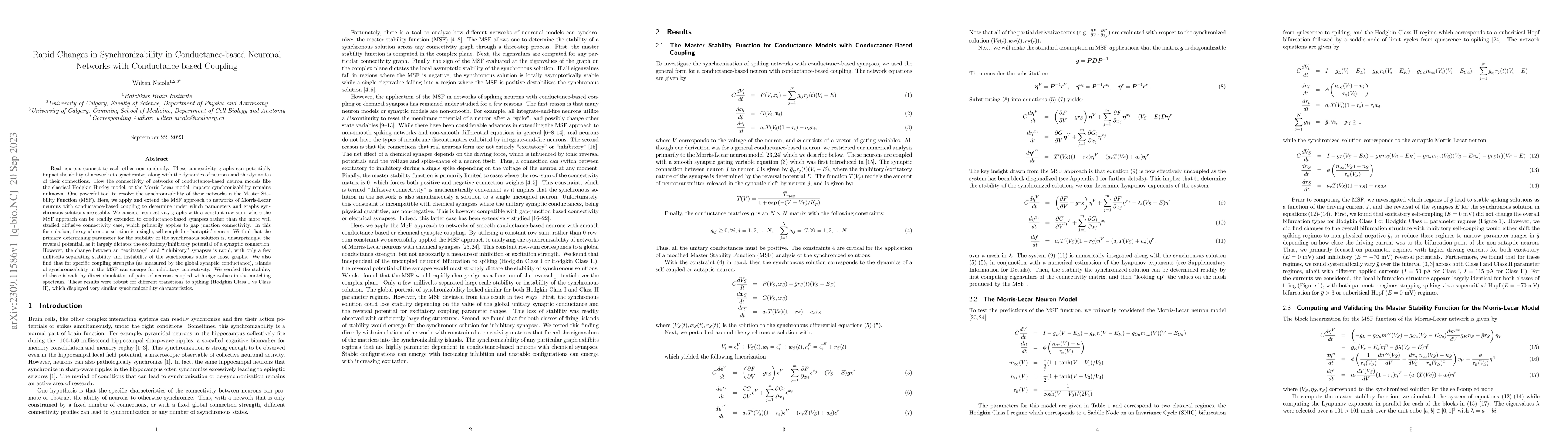 This paper explores the synchronizability of conductance-based neuronal networks using the Master Stability Function (MSF) approach, focusing on Morris-Lecar neurons with conductance-based coupling. It reveals that the stability of synchronous solutions is primarily determined by the reversal potential, with rapid changes in synchronizability occurring with small voltage shifts, and identifies islands of synchronizability for inhibitory connectivity under specific coupling strengths.