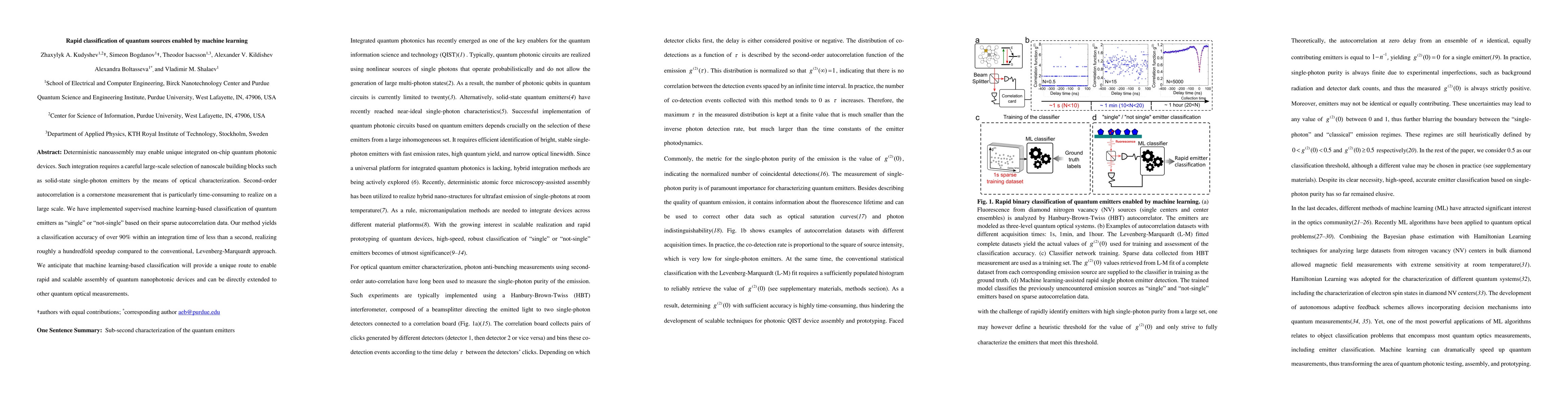 Deterministic nanoassembly may enable unique integrated on-chip quantum photonic devices. Such integration requires a careful large-scale selection of nanoscale building blocks such as solid-state single-photon emitters by the means of optical characterization. Second-order autocorrelation is a cornerstone measurement that is particularly time-consuming to realize on a large scale. We have implemented supervised machine learning-based classification of quantum emitters as "single" or "not-single" based on their sparse autocorrelation data. Our method yields a classification accuracy of over 90% within an integration time of less than a second, realizing roughly a hundredfold speedup compared to the conventional, Levenberg-Marquardt approach. We anticipate that machine learning-based classification will provide a unique route to enable rapid and scalable assembly of quantum nanophotonic devices and can be directly extended to other quantum optical measurements.