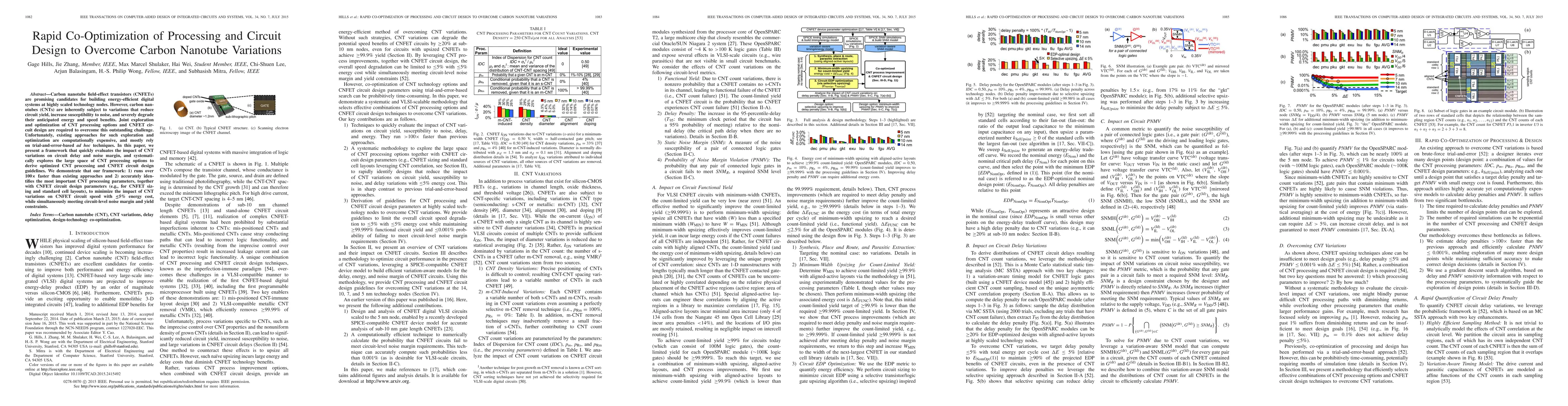 This paper proposes a rapid co-optimization framework to address carbon nanotube variations in CNFETs, achieving over 100x faster evaluation than existing methods while minimizing circuit delay and noise margin impacts. The framework identifies key processing and design parameters to optimize CNFET performance with minimal energy penalties.