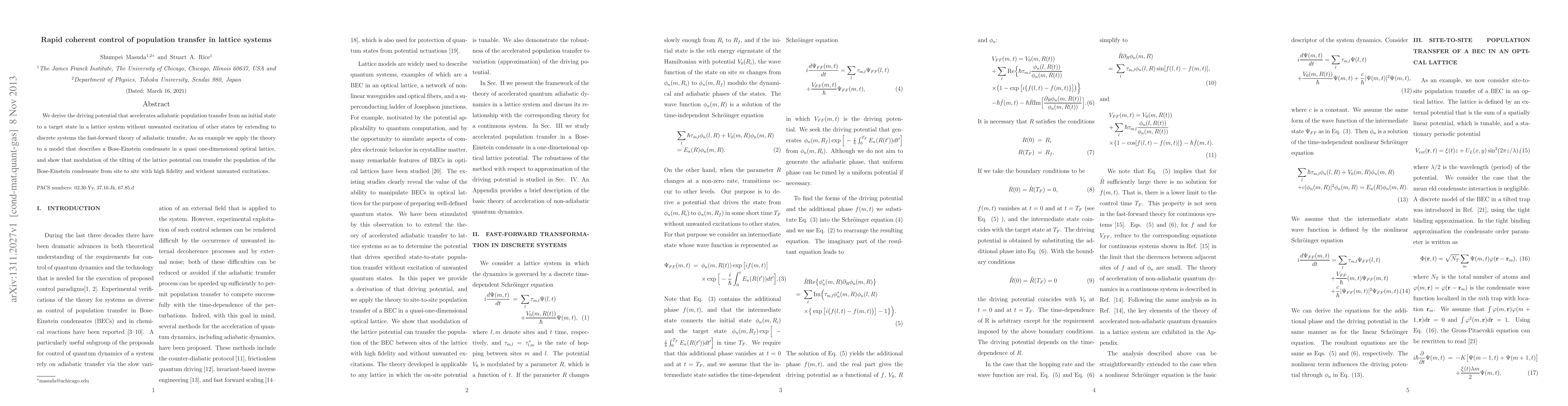 Researchers develop a method to control population transfer in lattice systems with high fidelity, using a driving potential that accelerates adiabatic transfer without unwanted excitations. The technique is demonstrated in a Bose-Einstein condensate model, showing promise for precise manipulation of quantum states.