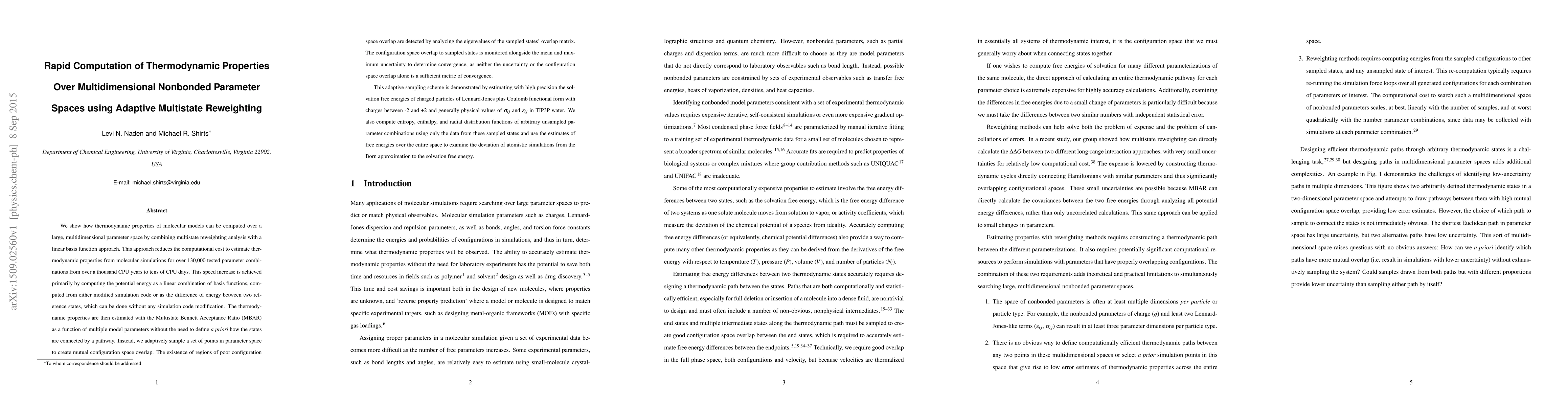We show how thermodynamic properties of molecular models can be computed over a large, multidimensional parameter space by combining multistate reweighting analysis with a linear basis function approach. This approach reduces the computational cost to estimate thermodynamic properties from molecular simulations for over 130,000 tested parameter combinations from over a thousand CPU years to tens of CPU days. This speed increase is achieved primarily by computing the potential energy as a linear combination of basis functions, computed from either modified simulation code or as the difference of energy between two reference states, which can be done without any simulation code modification. The thermodynamic properties are then estimated with the Multistate Bennett Acceptance Ratio (MBAR) as a function of multiple model parameters without the need to define a priori how the states are connected by a pathway. Instead, we adaptively sample a set of points in parameter space to create mutual configuration space overlap. The existence of regions of poor configuration space overlap are detected by analyzing the eigenvalues of the sampled states' overlap matrix. The configuration space overlap to sampled states is monitored alongside the mean and maximum uncertainty to determine convergence, as neither the uncertainty or the configuration space overlap alone is a sufficient metric of convergence. This adaptive sampling scheme is demonstrated by estimating with high precision the solvation free energies of charged particles of Lennard-Jones plus Coulomb functional form. We also compute entropy, enthalpy, and radial distribution functions of unsampled parameter combinations using only the data from these sampled states and use the free energies estimates to examine the deviation of simulations from the Born approximation to the solvation free energy.