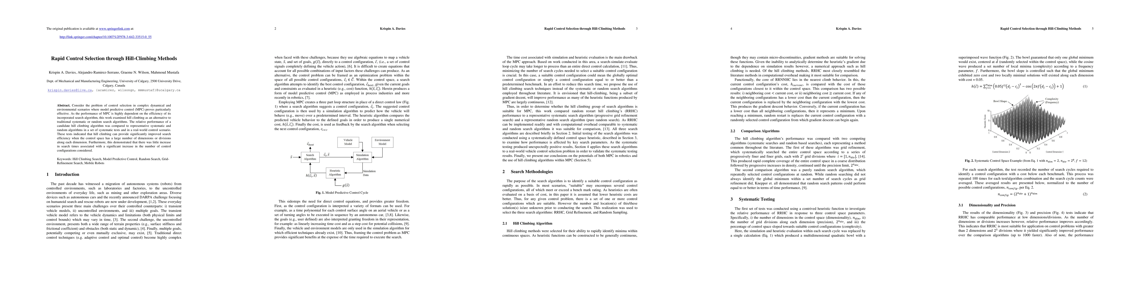 This paper investigates hill-climbing methods for control selection in model predictive control (MPC) scenarios, comparing its performance to systematic and random search algorithms. Results show that hill climbing offers improved search efficiency, especially in high-dimensional control spaces, with minimal increase in search time for more configurations.