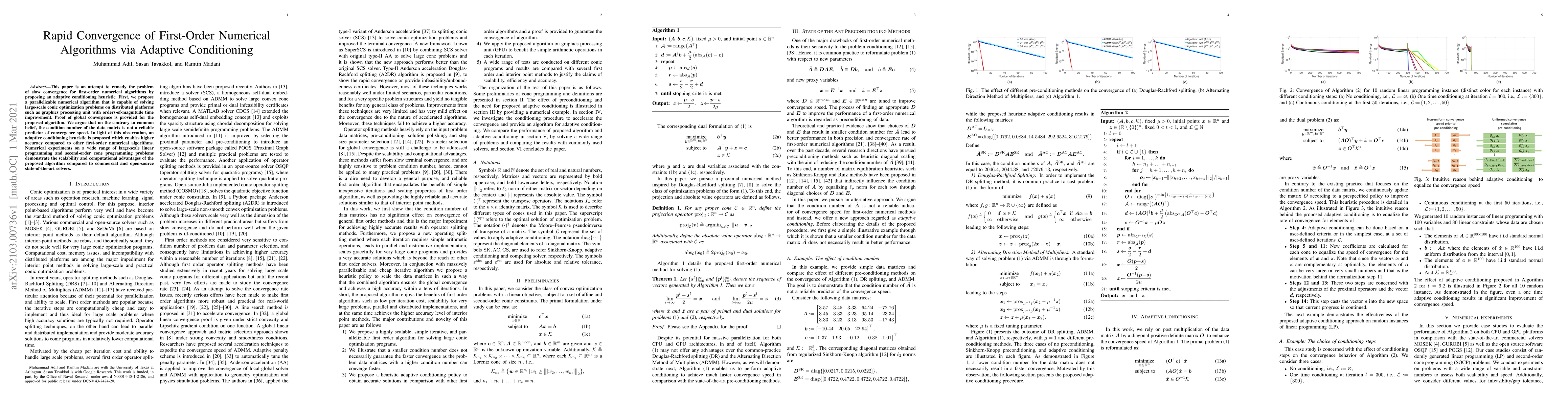 This paper is an attempt to remedy the problem of slow convergence for first-order numerical algorithms by proposing an adaptive conditioning heuristic. First, we propose a parallelizable numerical algorithm that is capable of solving large-scale conic optimization problems on distributed platforms such as {graphics processing unit} with orders-of-magnitude time improvement. Proof of global convergence is provided for the proposed algorithm. We argue that on the contrary to common belief, the condition number of the data matrix is not a reliable predictor of convergence speed. In light of this observation, an adaptive conditioning heuristic is proposed which enables higher accuracy compared to other first-order numerical algorithms. Numerical experiments on a wide range of large-scale linear programming and second-order cone programming problems demonstrate the scalability and computational advantages of the proposed algorithm compared to commercial and open-source state-of-the-art solvers.