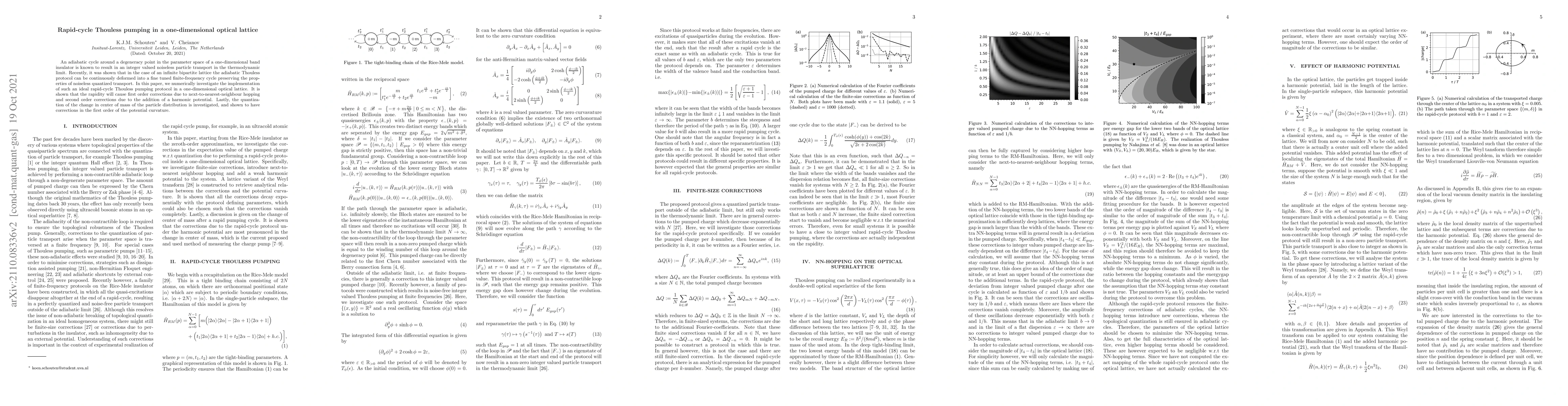 This paper investigates rapid-cycle Thouless pumping in a one-dimensional optical lattice, demonstrating that while the protocol maintains quantized transport, first-order corrections arise from next-to-nearest-neighbour hopping and second-order corrections from a harmonic potential, with first-order corrections in the center of mass change due to potential curvature.