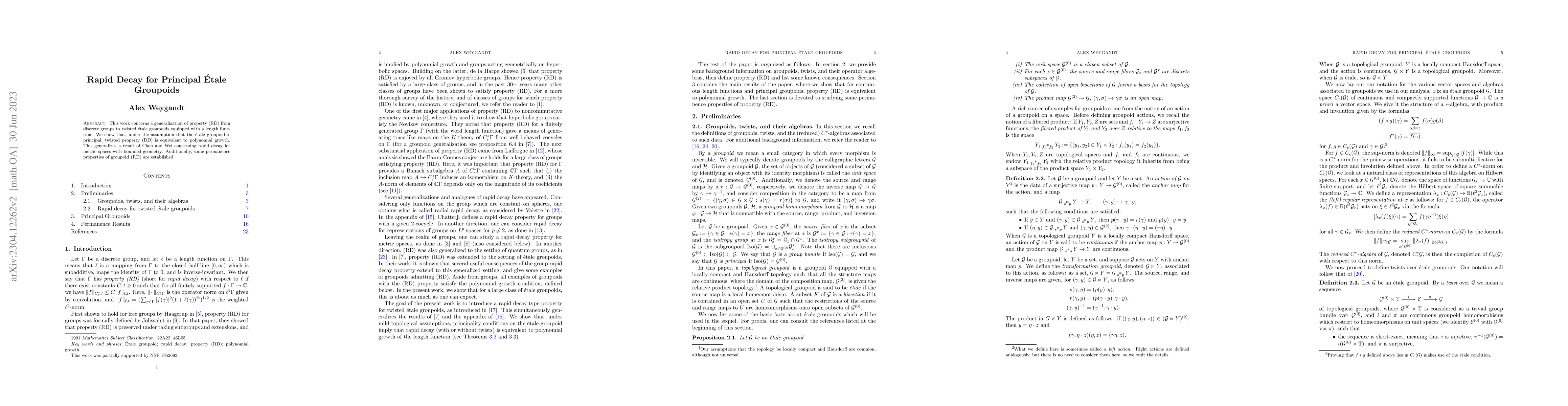 This paper generalizes rapid decay (RD) from discrete groups to principal \'etale groupoids with a length function, showing that RD is equivalent to polynomial growth. It also establishes permanence properties for groupoid RD.