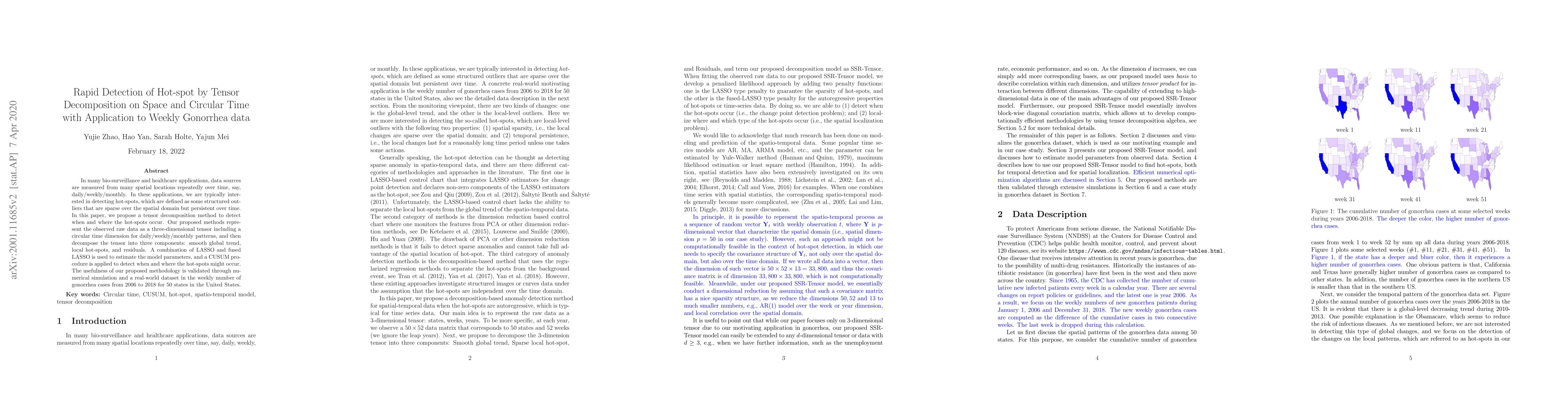 This paper proposes a tensor decomposition method for detecting hot-spots in bio-surveillance data, represented as a three-dimensional tensor with a circular time dimension. The method decomposes the data into global trends, local hot-spots, and residuals, using LASSO and fused LASSO for parameter estimation, and a CUSUM procedure for hot-spot detection, validated with gonorrhea data from 2006 to 2018 across 50 U.S. states.