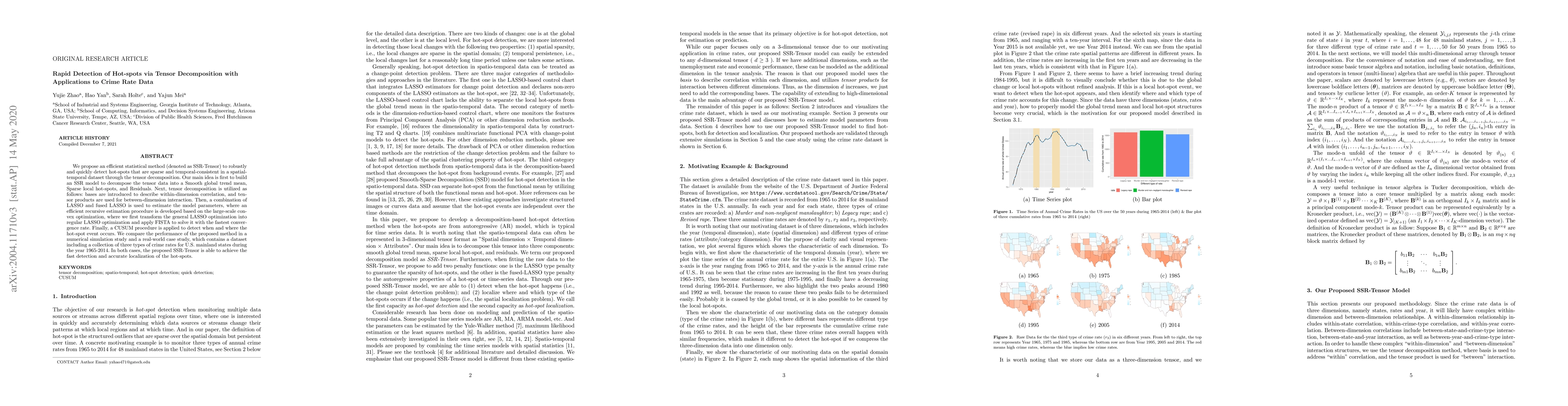 The paper proposes SSR-Tensor, a statistical method for rapidly detecting sparse and temporal-consistent hot-spots in spatial-temporal datasets using tensor decomposition. The method combines LASSO and fused LASSO with tensor products for efficient parameter estimation, followed by a CUSUM procedure for hot-spot detection, demonstrating effectiveness in both simulation and real crime rate data.