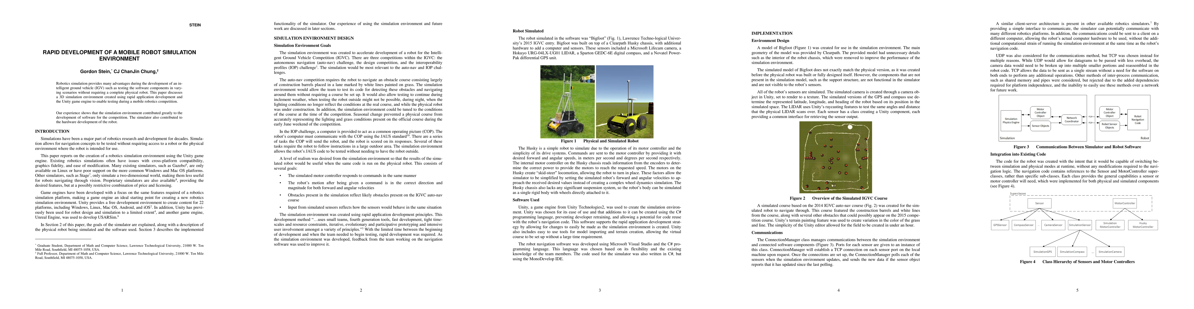 Robotics simulation provides many advantages during the development of an intelligent ground vehicle (IGV) such as testing the software components in varying scenarios without requiring a complete physical robot. This paper discusses a 3D simulation environment created using rapid application development and the Unity game engine to enable testing during a mobile robotics competition. Our experience shows that the simulation environment contributed greatly to the development of software for the competition. The simulator also contributed to the hardware development of the robot.
