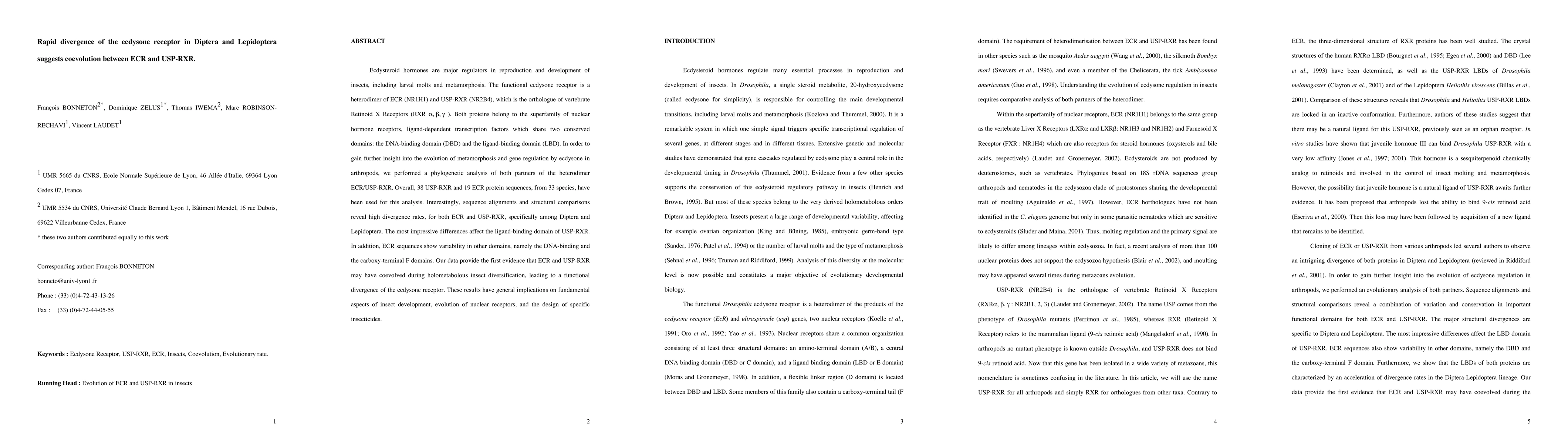 This study reveals rapid divergence of the ecdysone receptor components ECR and USP-RXR in Diptera and Lepidoptera, suggesting coevolution between these proteins. The findings indicate functional divergence of the ecdysone receptor, with significant implications for insect development and potential applications in insecticide design.
