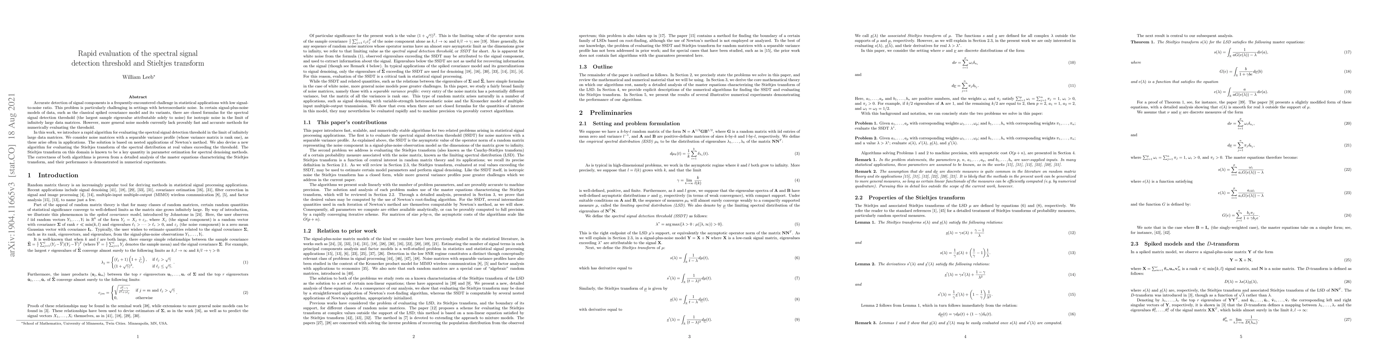 This paper introduces rapid algorithms for evaluating the spectral signal detection threshold and the Stieltjes transform in large data matrices with heteroscedastic noise, using nested applications of Newton's method and demonstrating their effectiveness through numerical experiments.