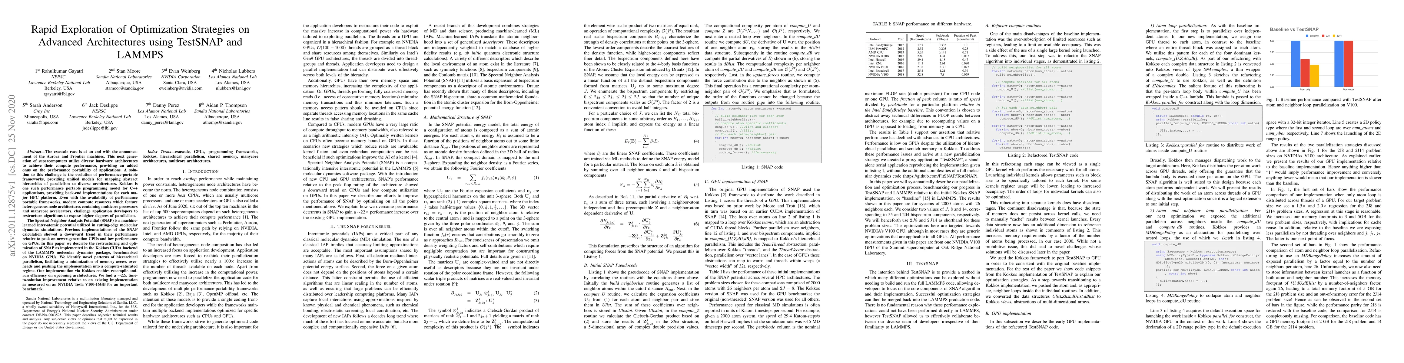The exascale race is at an end with the announcement of the Aurora and Frontier machines. This next generation of supercomputers utilize diverse hardware architectures to achieve their compute performance, providing an added onus on the performance portability of applications. An expanding fragmentation of programming models would provide a compounding optimization challenge were it not for the evolution of performance-portable frameworks, providing unified models for mapping abstract hierarchies of parallelism to diverse architectures. A solution to this challenge is the evolution of performance-portable frameworks, providing unified models for mapping abstract hierarchies of parallelism to diverse architectures. Kokkos is one such performance portable programming model for C++ applications, providing back-end implementations for each major HPC platform. Even with a performance portable framework, restructuring algorithms to expose higher degrees of parallelism is non-trivial. The Spectral Neighbor Analysis Potential (SNAP) is a machine-learned inter-atomic potential utilized in cutting-edge molecular dynamics simulations. Previous implementations of the SNAP calculation showed a downward trend in their performance relative to peak on newer-generation CPUs and low performance on GPUs. In this paper we describe the restructuring and optimization of SNAP as implemented in the Kokkos CUDA backend of the LAMMPS molecular dynamics package, benchmarked on NVIDIA GPUs. We identify novel patterns of hierarchical parallelism, facilitating a minimization of memory access overheads and pushing the implementation into a compute-saturated regime. Our implementation via Kokkos enables recompile-and-run efficiency on upcoming architectures. We find a $\sim$22x time-to-solution improvement relative to an existing implementation as measured on an NVIDIA Tesla V100-16GB for an important benchmark.
