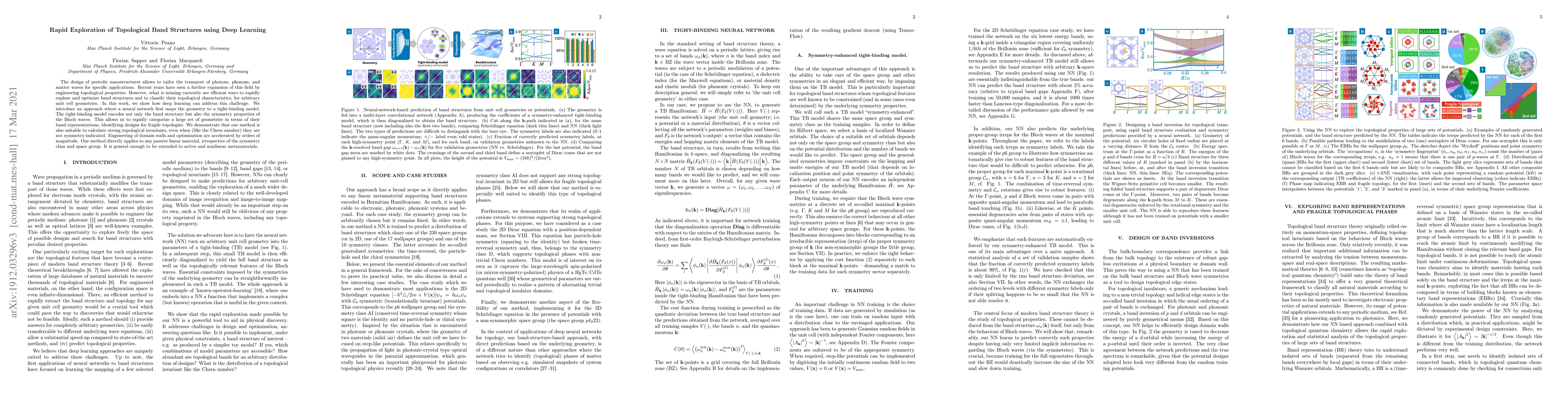 The design of periodic nanostructures allows to tailor the transport of photons, phonons, and matter waves for specific applications. Recent years have seen a further expansion of this field by engineering topological properties. However, what is missing currently are efficient ways to rapidly explore and optimize band structures and to classify their topological characteristics, for arbitrary unit cell geometries. In this work, we show how deep learning can address this challenge. We introduce an approach where a neural network first maps the geometry to a tight-binding model. This allows us to exploit any underlying space group and predict the symmetries of Bloch waves. We demonstrate how that helps to rapidly categorize a large set of geometries in terms of their band representations, identifying designs for fragile topologies. Engineering of domain walls and optimization are also accelerated by orders of magnitude. The approach is general enough to permit future applications to the geometry discovery in other classes of materials (e.g. active and nonlinear metamaterials).