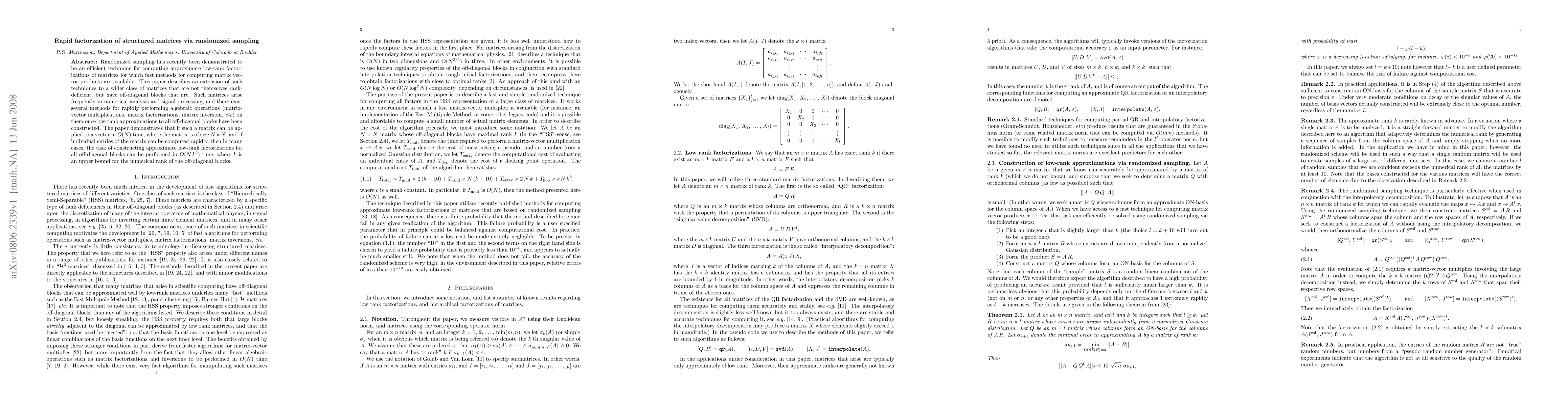 Randomized sampling has recently been demonstrated to be an efficient technique for computing approximate low-rank factorizations of matrices for which fast methods for computing matrix vector products are available. This paper describes an extension of such techniques to a wider class of matrices that are not themselves rank-deficient, but have off-diagonal blocks that are. Such matrices arise frequently in numerical analysis and signal processing, and there exist several methods for rapidly performing algebraic operations (matrix-vector multiplications, matrix factorizations, matrix inversion, \textit{etc}) on them once low-rank approximations to all off-diagonal blocks have been constructed. The paper demonstrates that if such a matrix can be applied to a vector in O(N) time, where the matrix is of size $N\times N$, and if individual entries of the matrix can be computed rapidly, then in many cases, the task of constructing approximate low-rank factorizations for all off-diagonal blocks can be performed in $O(N k^{2})$ time, where $k$ is an upper bound for the numerical rank of the off-diagonal blocks.