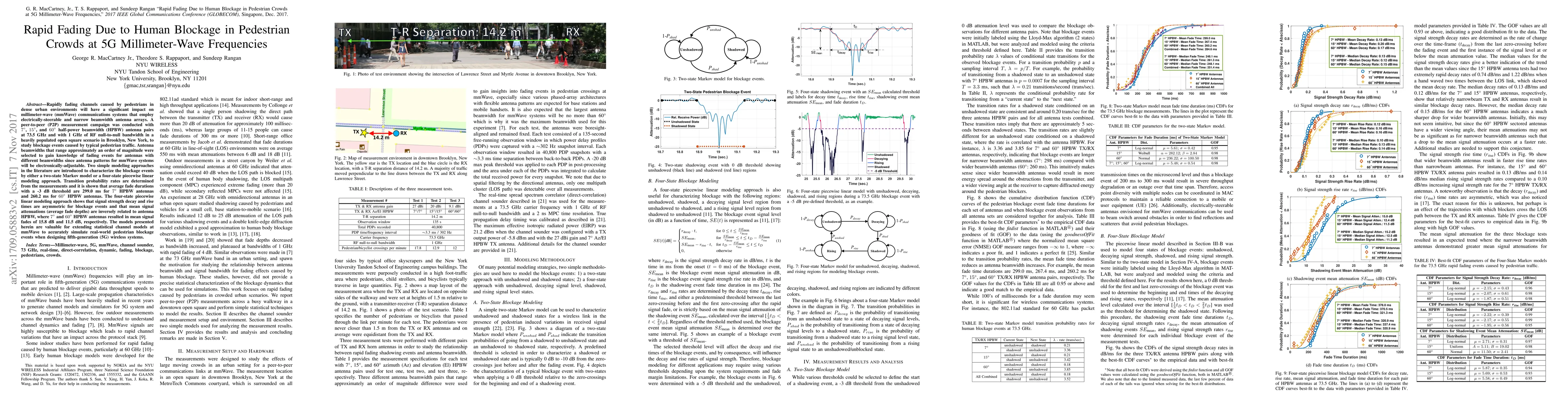 Rapidly fading channels caused by pedestrians in dense urban environments will have a significant impact on millimeter-wave (mmWave) communications systems that employ electrically-steerable and narrow beamwidth antenna arrays. A peer-to-peer (P2P) measurement campaign was conducted with 7-degree, 15-degree, and 60-degree half-power beamwidth (HPBW) antenna pairs at 73.5 GHz and with 1 GHz of RF null-to-null bandwidth in a heavily populated open square scenario in Brooklyn, New York, to study blockage events caused by typical pedestrian traffic. Antenna beamwidths that range approximately an order of magnitude were selected to gain knowledge of fading events for antennas with different beamwidths since antenna patterns for mmWave systems will be electronically-adjustable. Two simple modeling approaches in the literature are introduced to characterize the blockage events by either a two-state Markov model or a four-state piecewise linear modeling approach. Transition probability rates are determined from the measurements and it is shown that average fade durations with a -5 dB threshold are 299.0 ms for 7-degree HPBW antennas and 260.2 ms for 60-degree HPBW antennas. The four-state piecewise linear modeling approach shows that signal strength decay and rise times are asymmetric for blockage events and that mean signal attenuations (average fade depths) are inversely proportional to antenna HPBW, where 7-degree and 60-degree HPBW antennas resulted in mean signal fades of 15.8 dB and 11.5 dB, respectively. The models presented herein are valuable for extending statistical channel models at mmWave to accurately simulate real-world pedestrian blockage events when designing fifth-generation (5G) wireless systems.